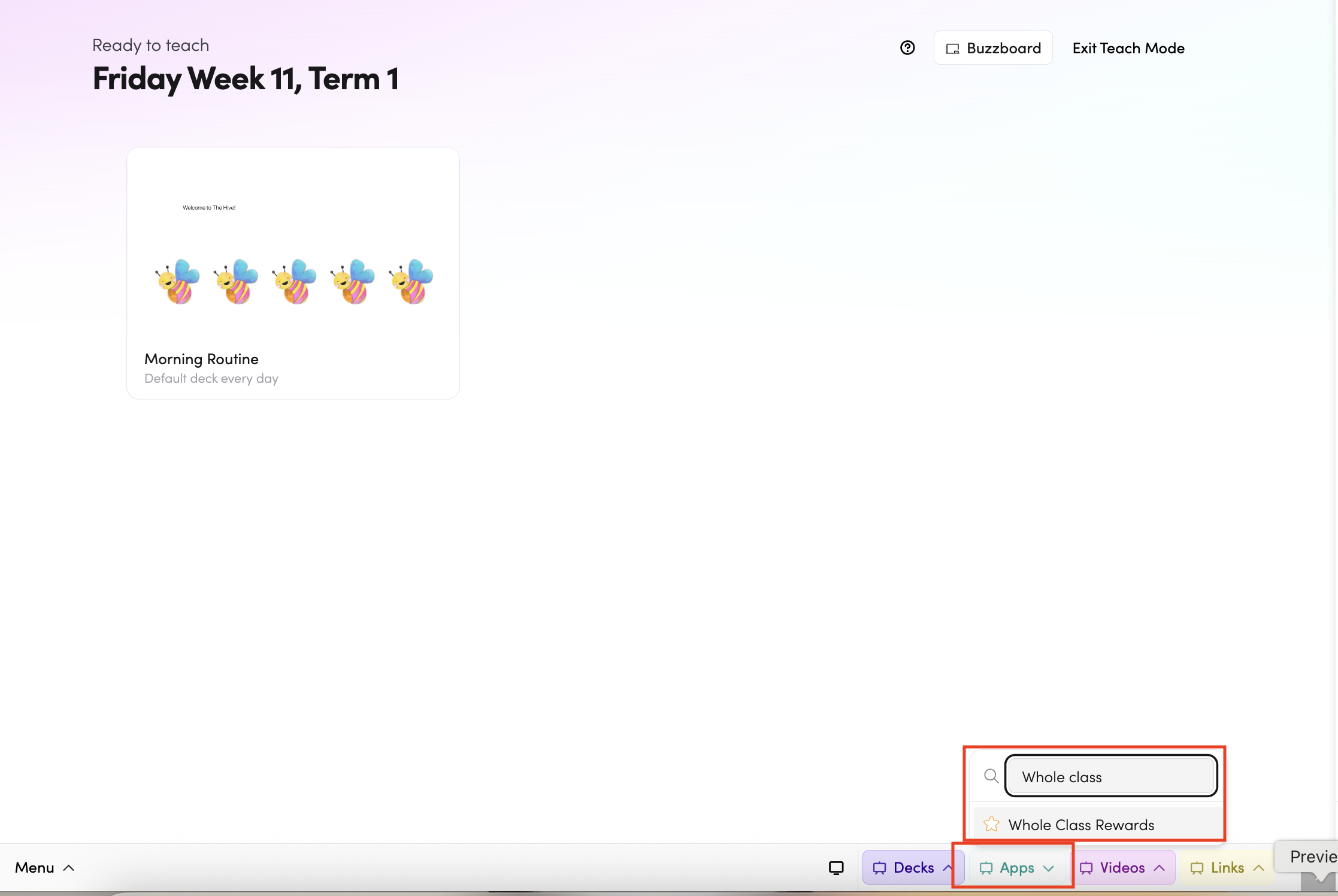 - Through Teach Mode — open Whole Class Rewards directly from the bottom bar of Teach Mode.