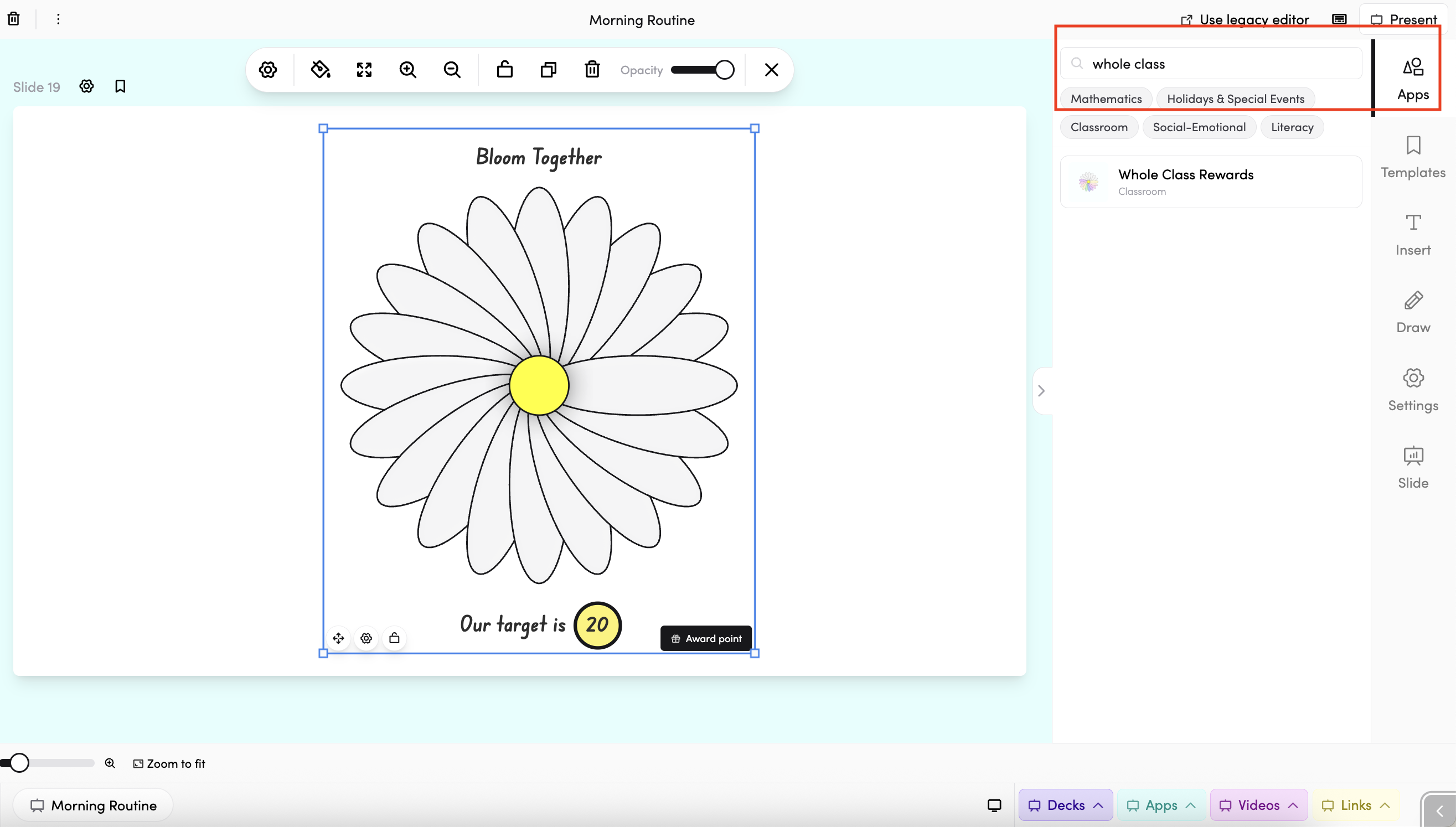 - In your slide deck — search for Whole Class Rewards in the apps panel on the right and tap it to drop it onto your slide. From there, you can move and resize it however you like. The Award point button is visible directly on the slide so you can add points without leaving your deck. Points sync automatically with the app.