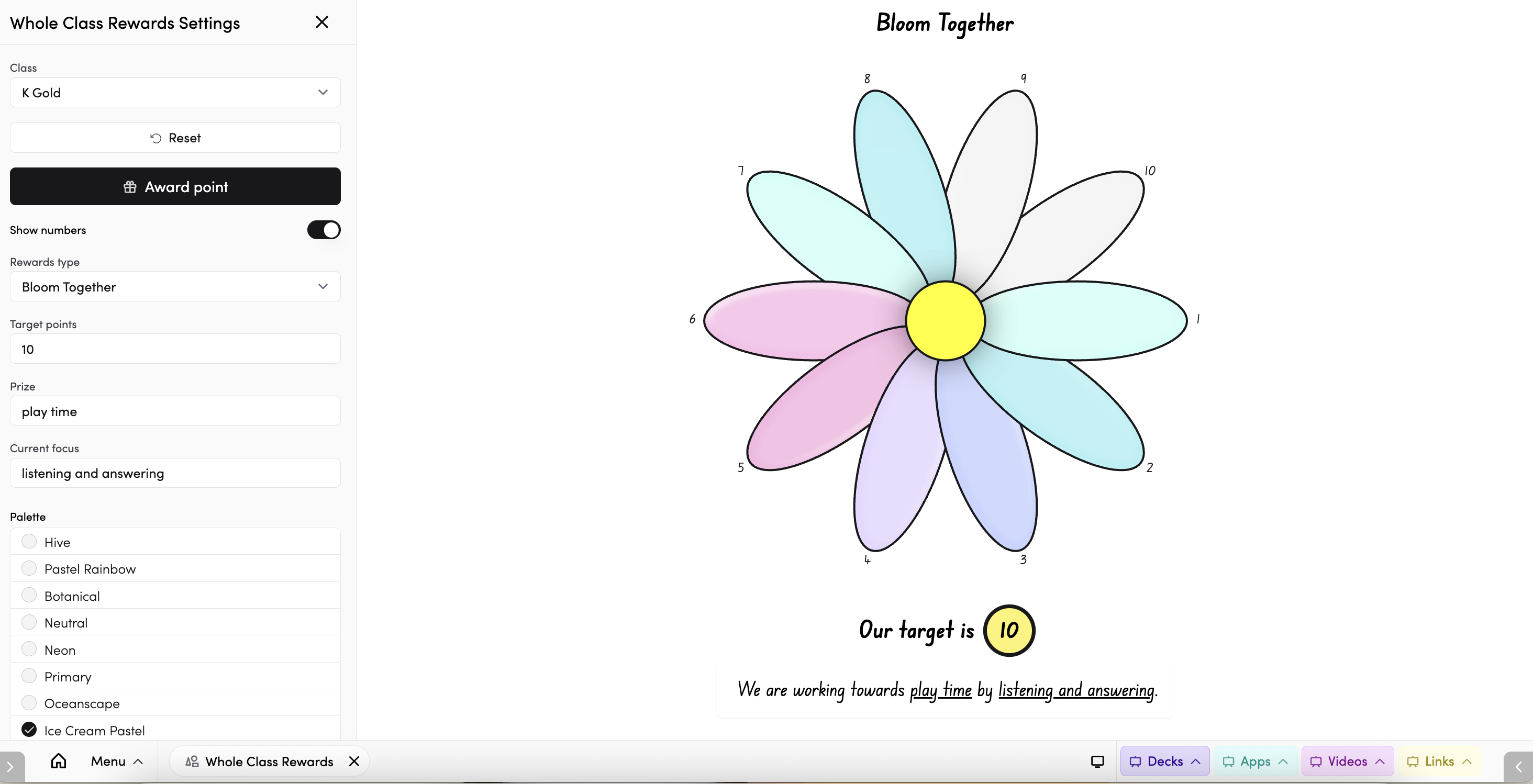 Whole Class Rewards is a visual class points tracker that motivates students to work together towards a shared goal. Choose a reward type, set a target, and award points as a class earns them — points automatically sync whether you access the app or the slide deck.