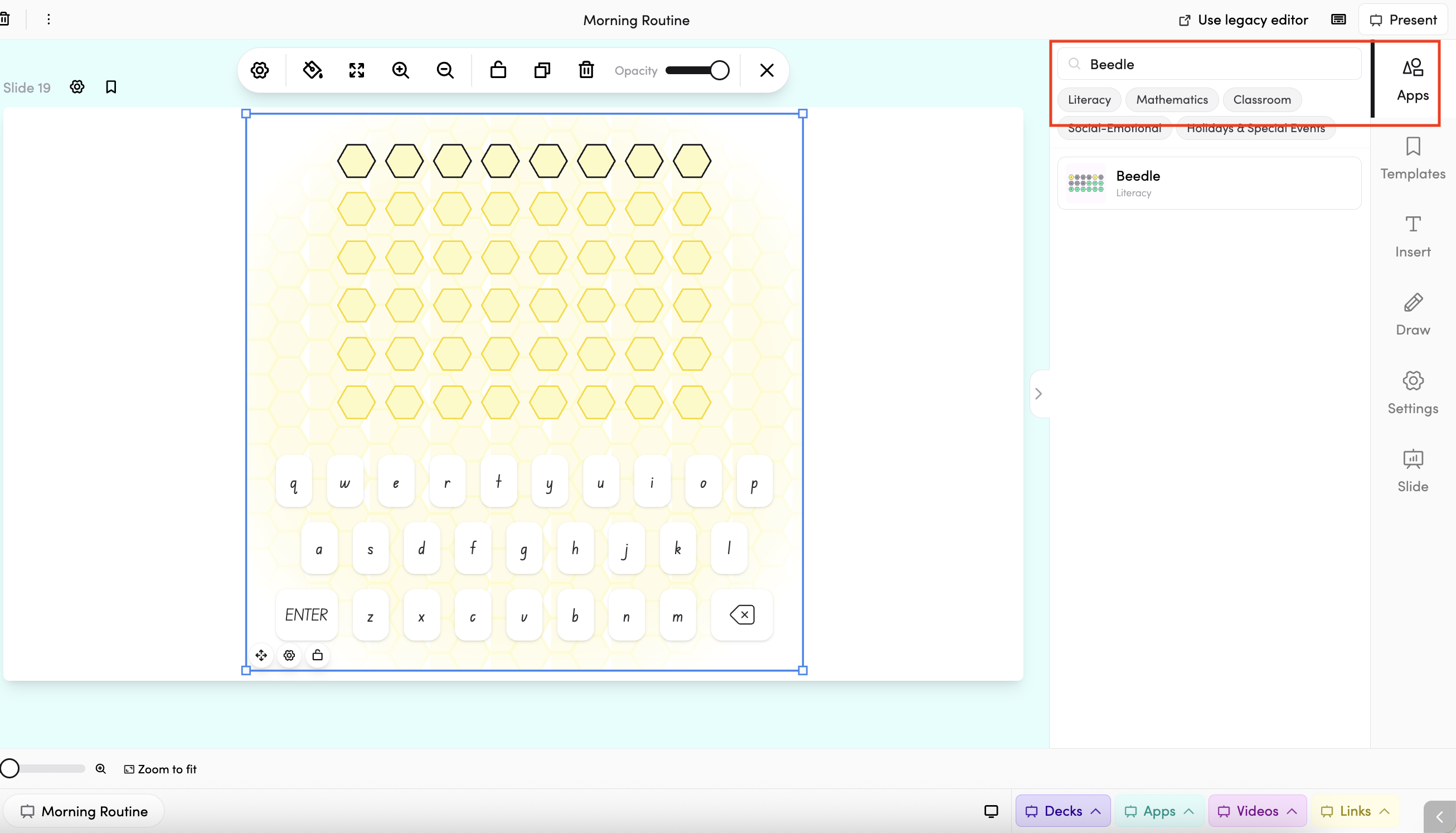 - In your slide deck — search for Beedle in the apps panel on the right and tap it to drop it onto your slide. From there, you can move and resize it however you like.