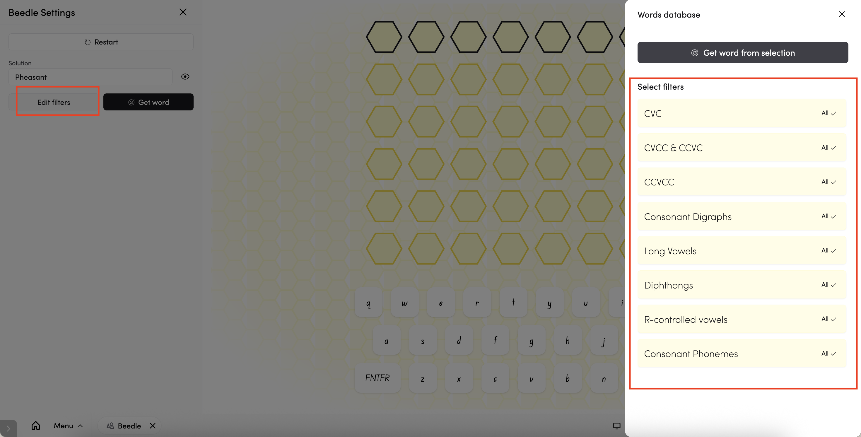 Tap Edit filters to open the words database and choose which phonics categories can appear in randomly generated words. You can filter by: