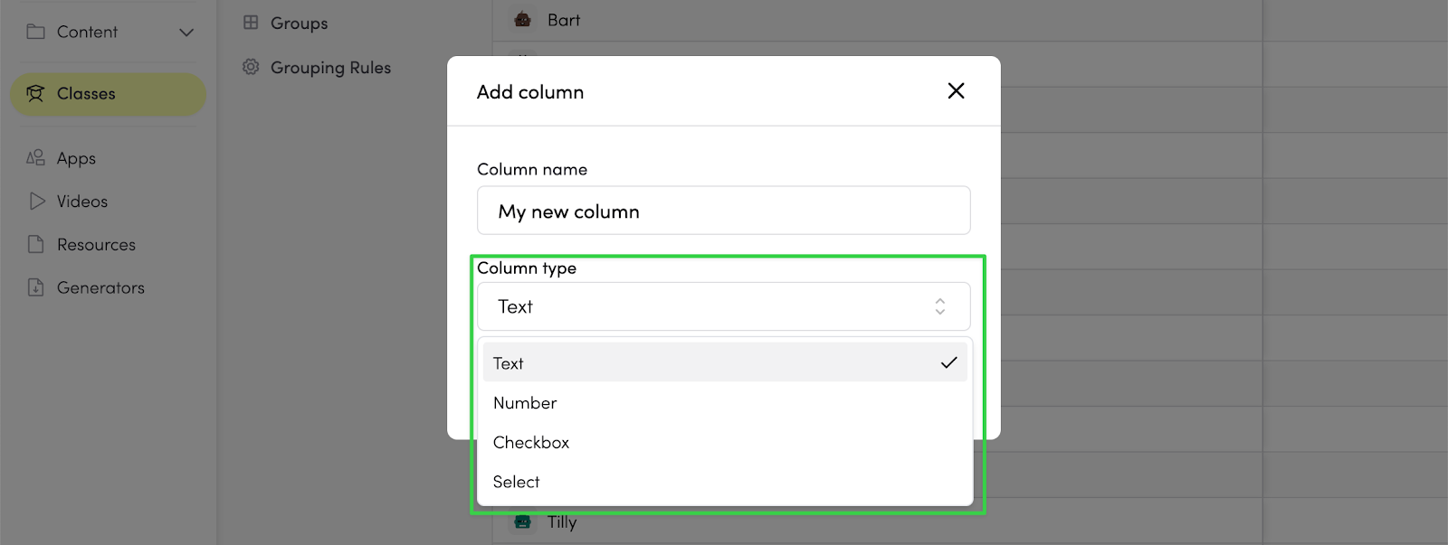 - Edit options: Change the supported options for a select column type