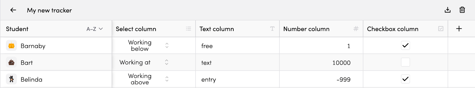Student Trackers help you keep track of student progress, behaviours, skills, or any other data you want to monitor across your class. Think of them as customisable spreadsheets tailored for your classroom needs.