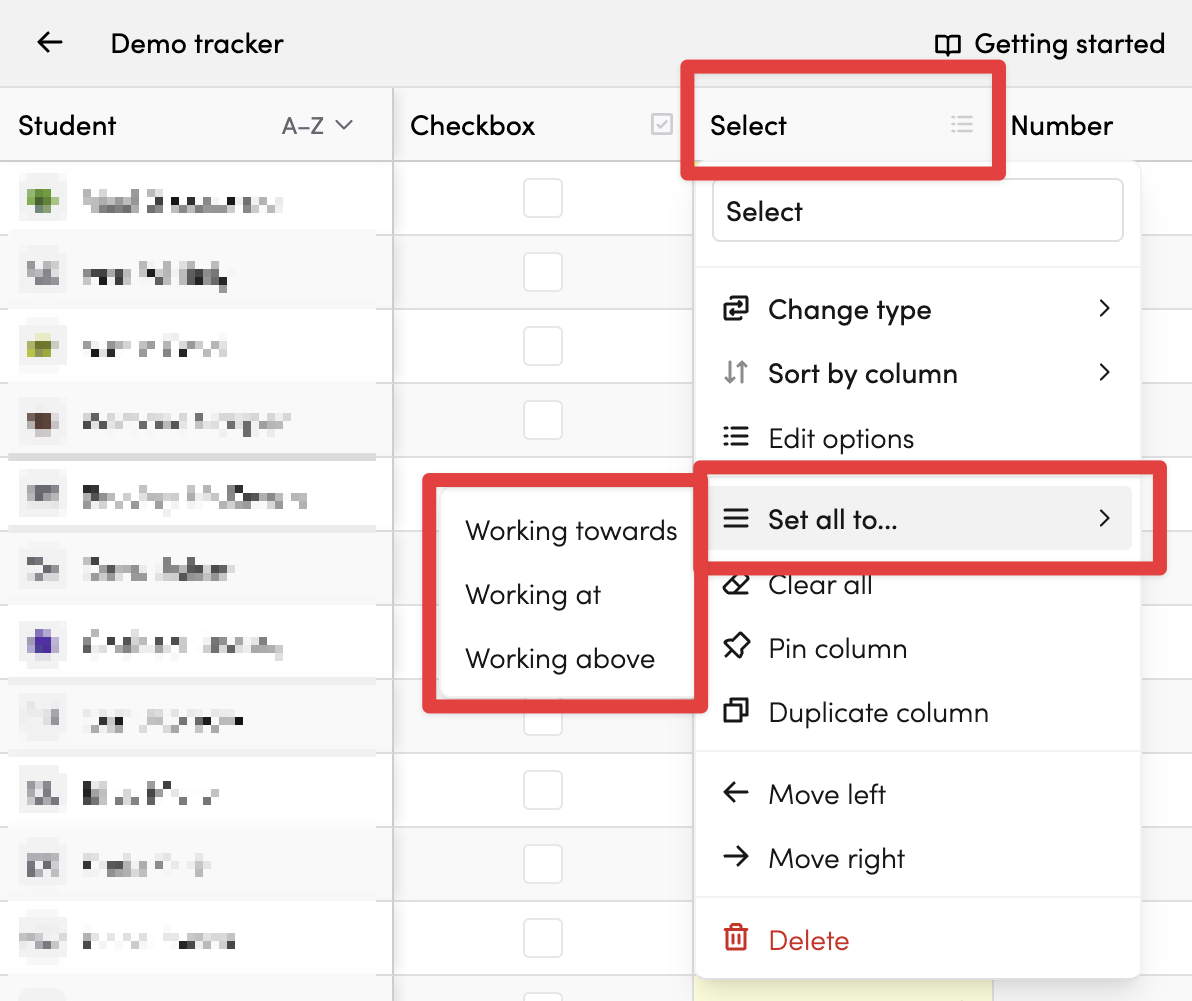 - Set all to...: Opens a submenu with your options - choose one to apply it to all students