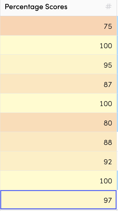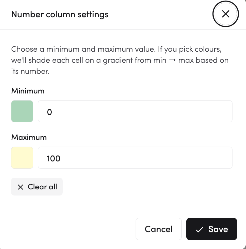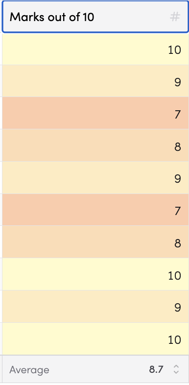 You can also assign colours to your minimum and maximum values. When set, cells will display a gradient background based on where the value falls in the range - making it easy to spot high and low values at a glance.