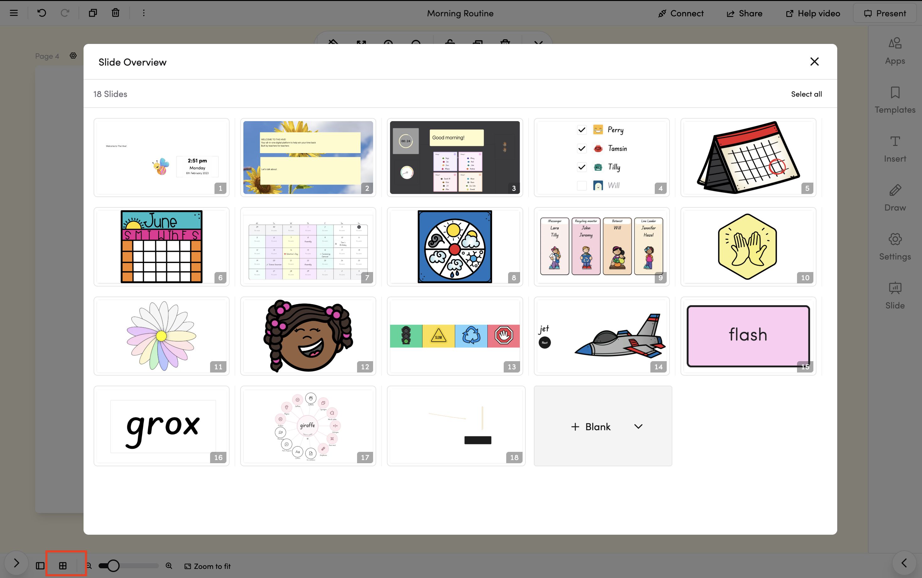 - Grid view button: Open a grid overview of all your slides for quick reordering and bulk actions