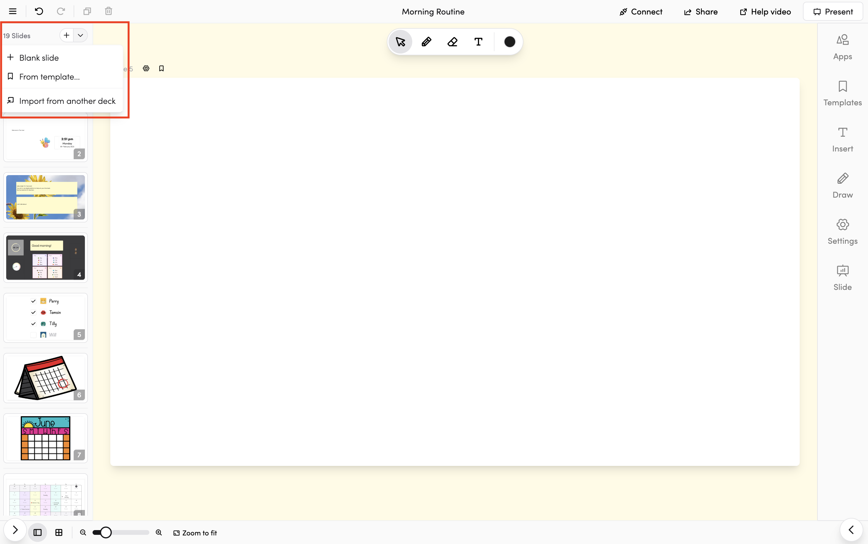 - Click the + button to add a new slide (or use the dropdown arrow to add from a template, or import from another deck)