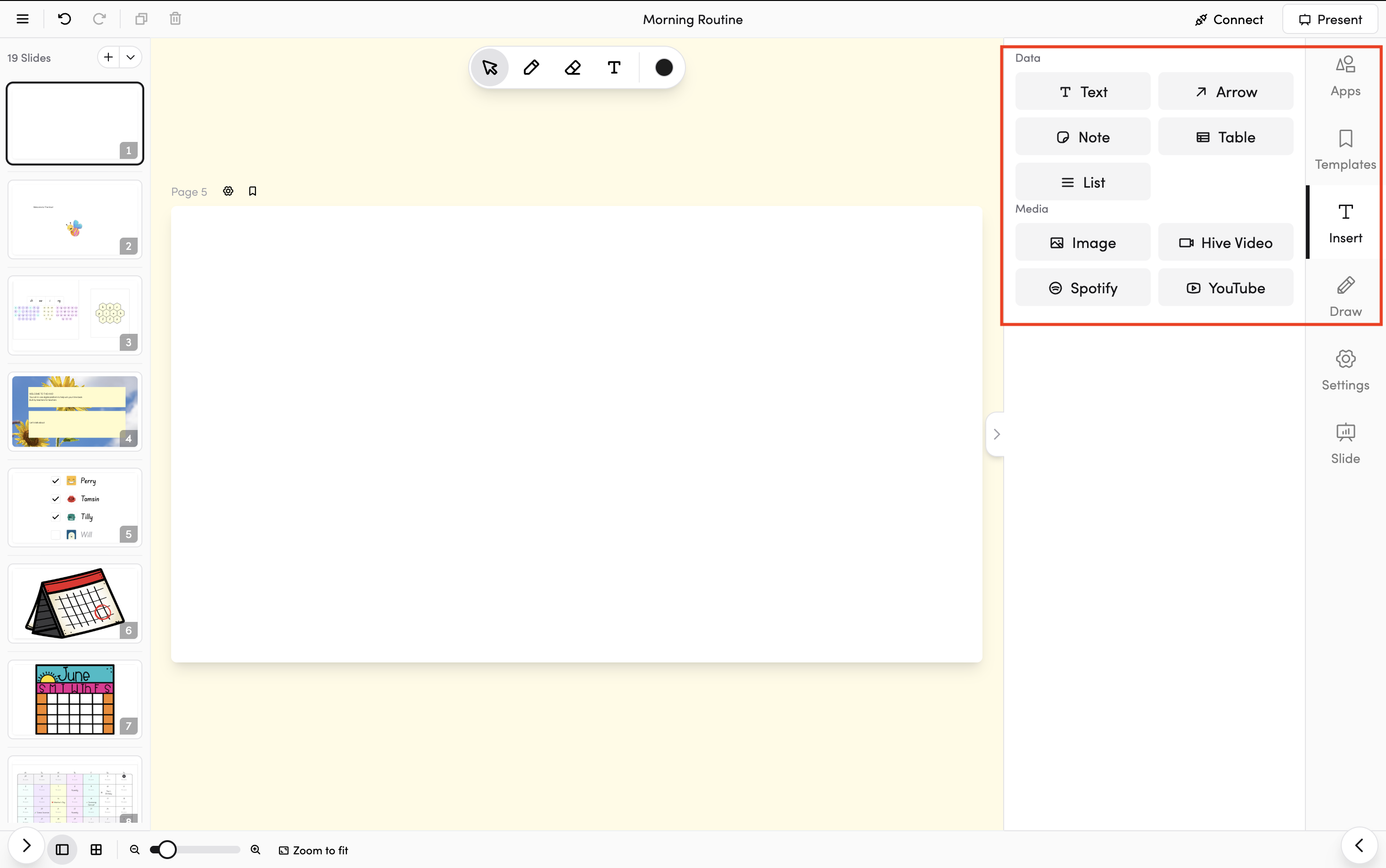 Open the Insert tab (Shift+I) to add images, videos, text, arrows, notes, tables, and lists.