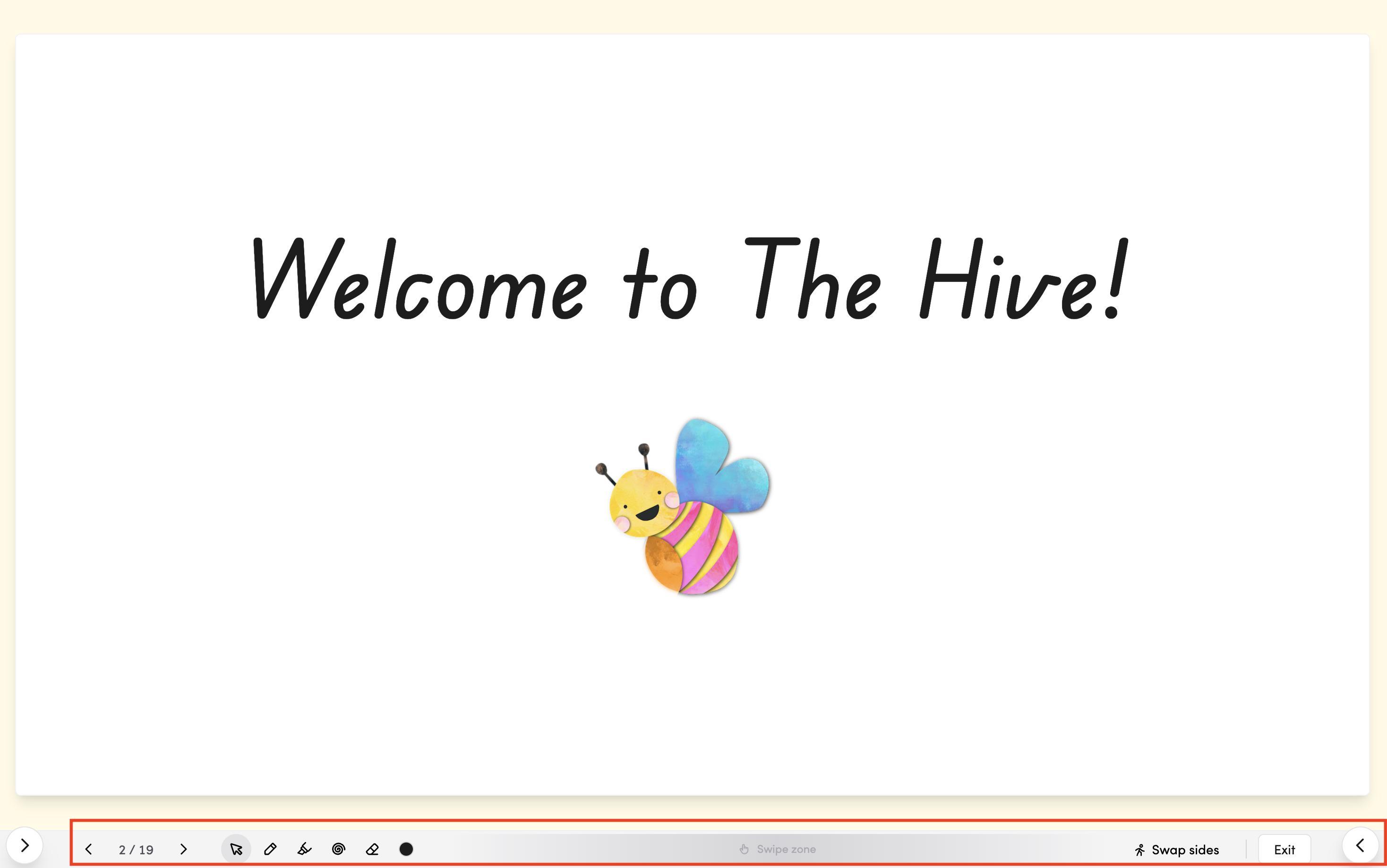 - To move between slides: use left and right arrow keys or click the centre buttons in the navigation toolbar. On a touch-enabled device, swipe zones are available to the left and right of the central buttons for quick navigation no matter which side of the IWB you're standing on.