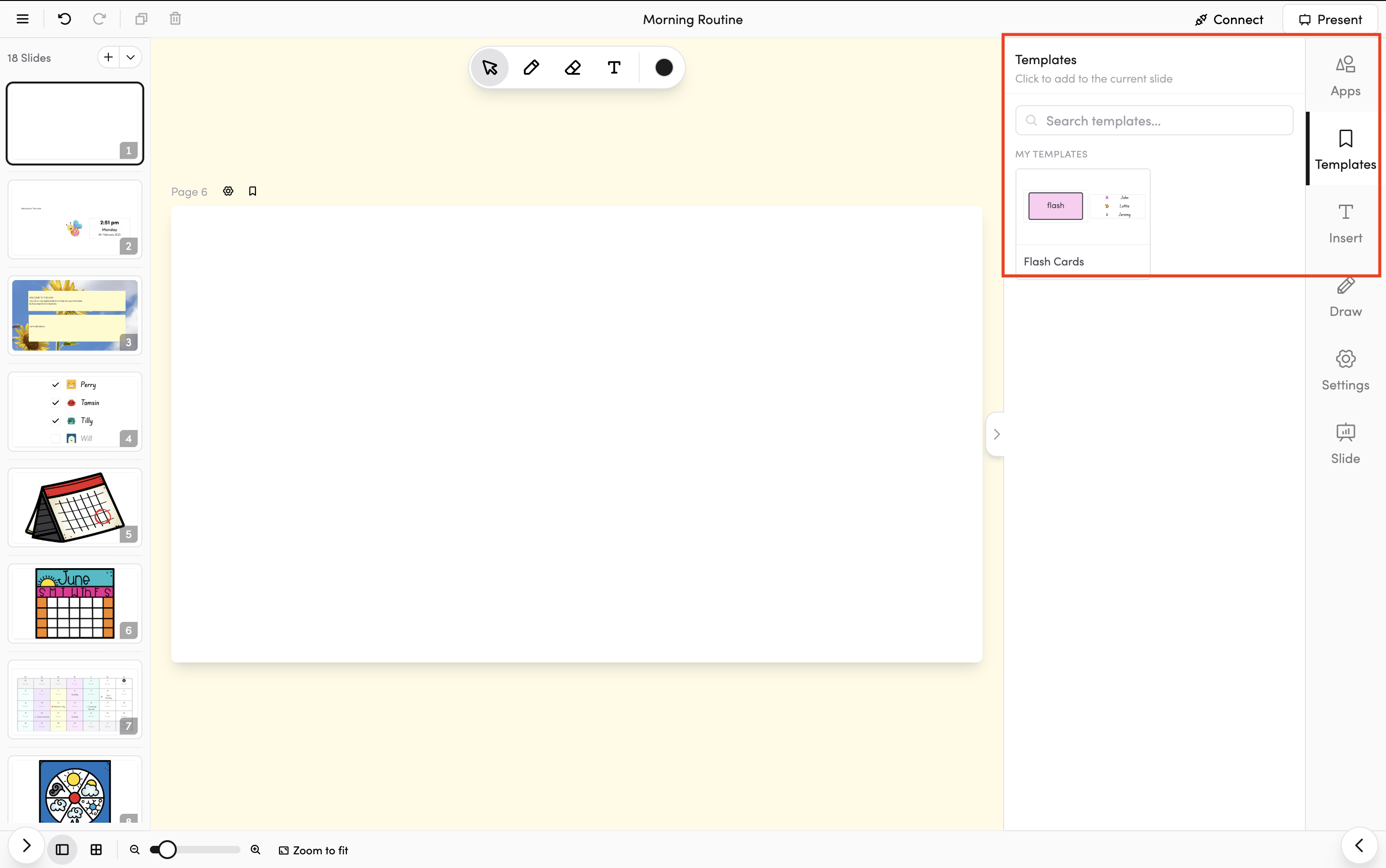 - Templates include all content from the original slide — text, shapes, images, apps, and background settings