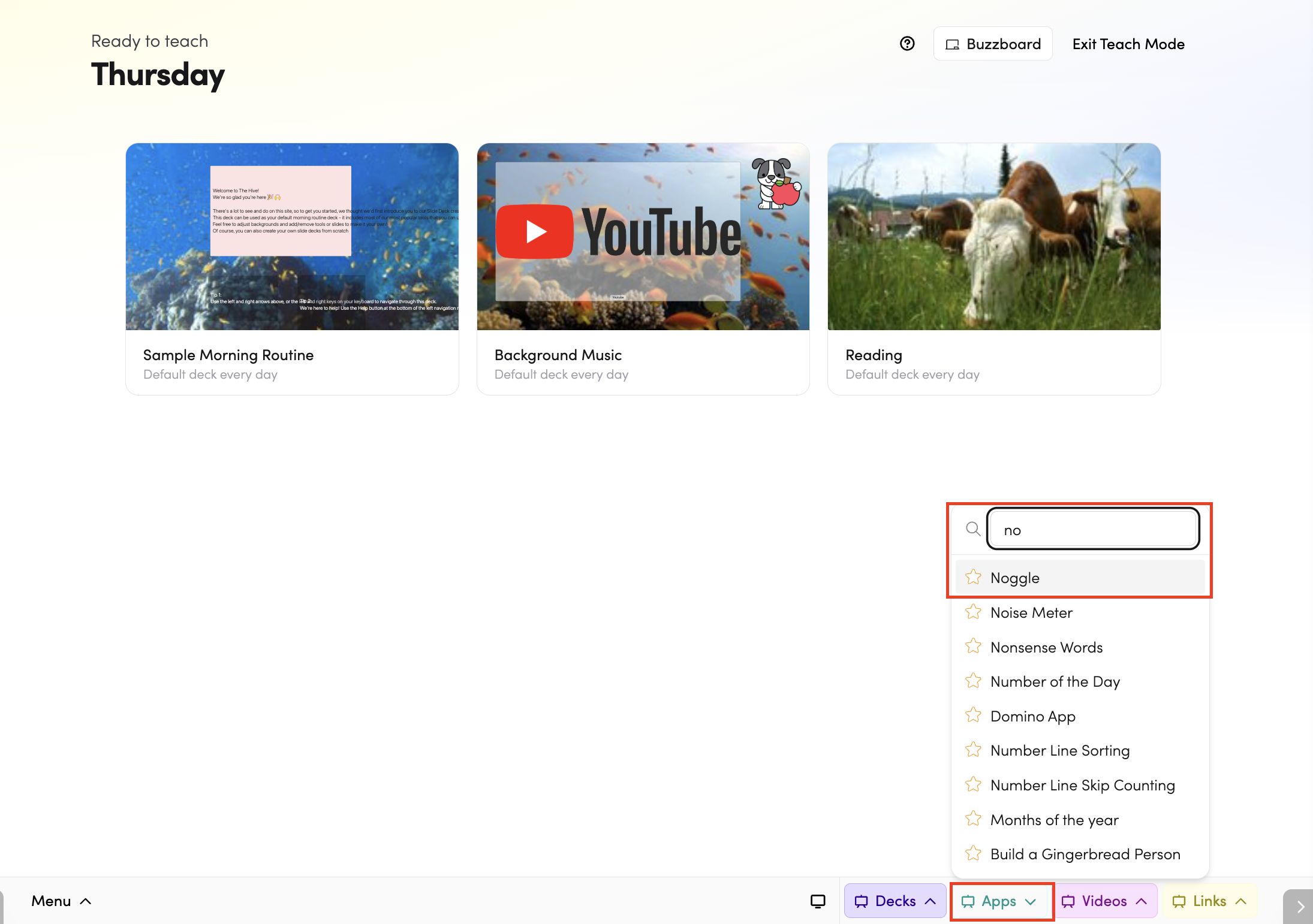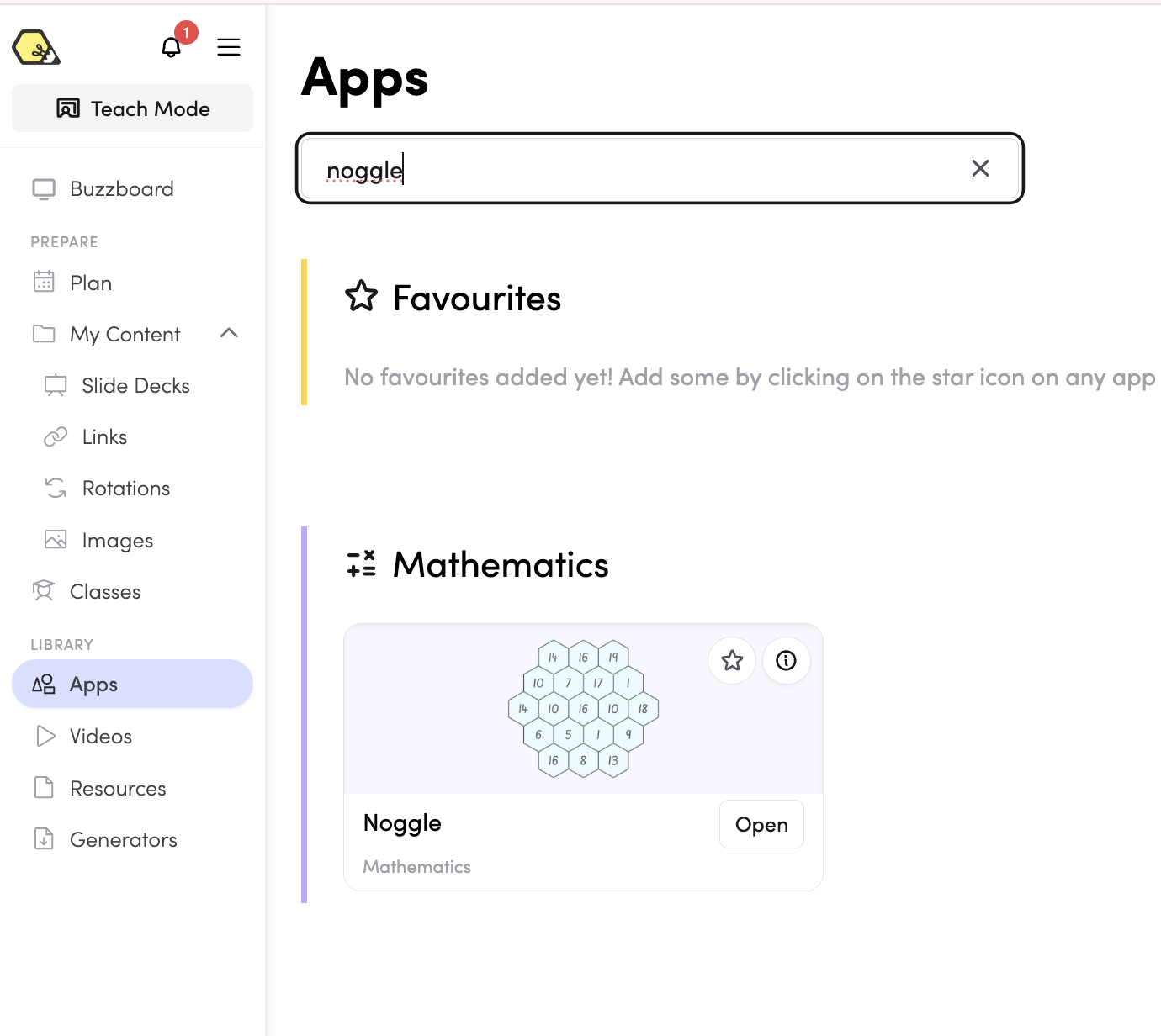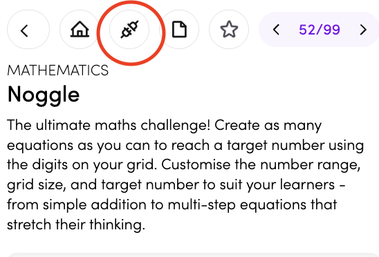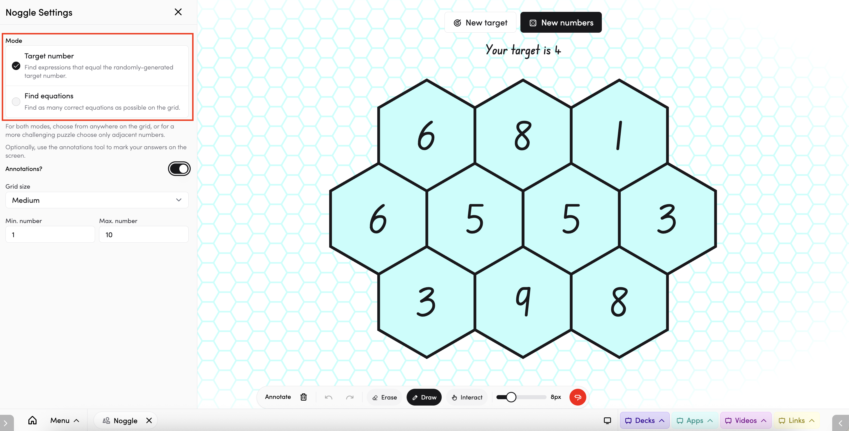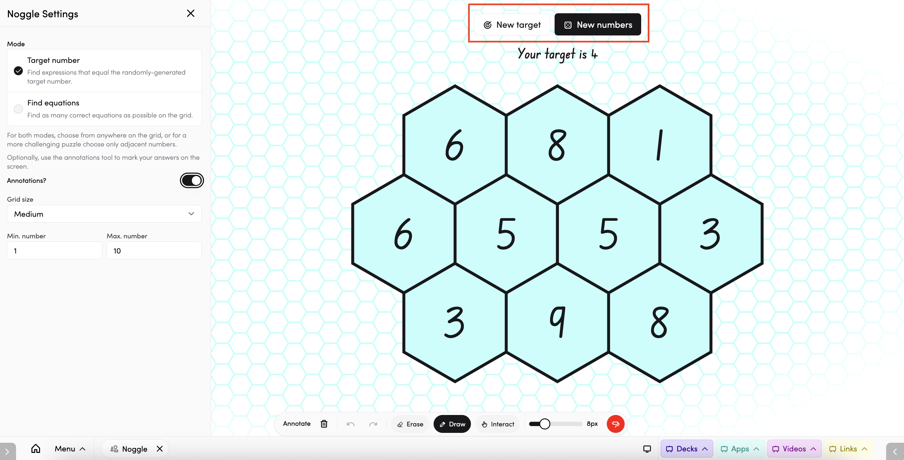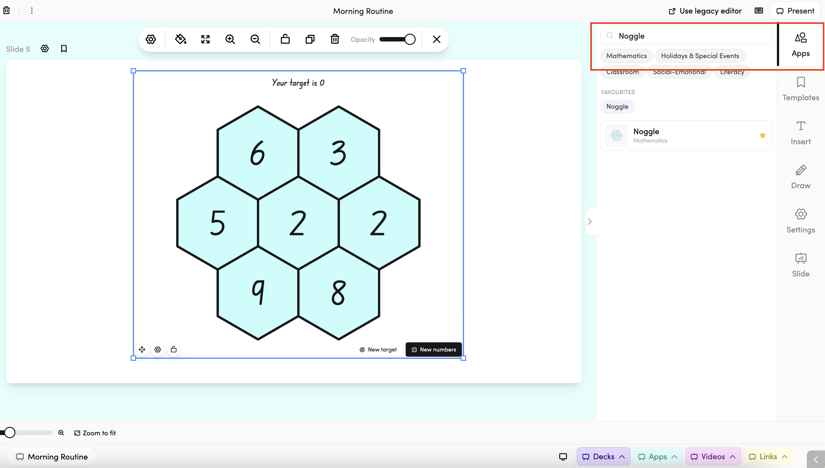 In your slide deck - search Noggle in the apps panel on the right and tap it to drop it onto your slide. From there, you can move and resize it however you like. The New target and New numbers buttons sit at the bottom of the app, so you can keep things fresh during your lesson without leaving the deck.