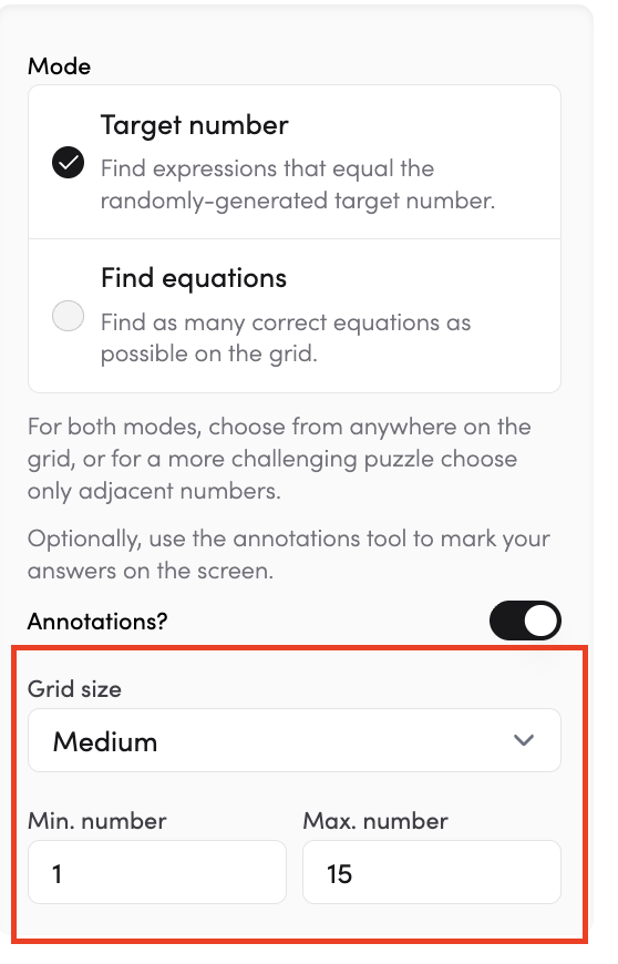 - Min. number / Max. number - set the range of numbers that can appear in the grid (e.g. 1–15). (image)