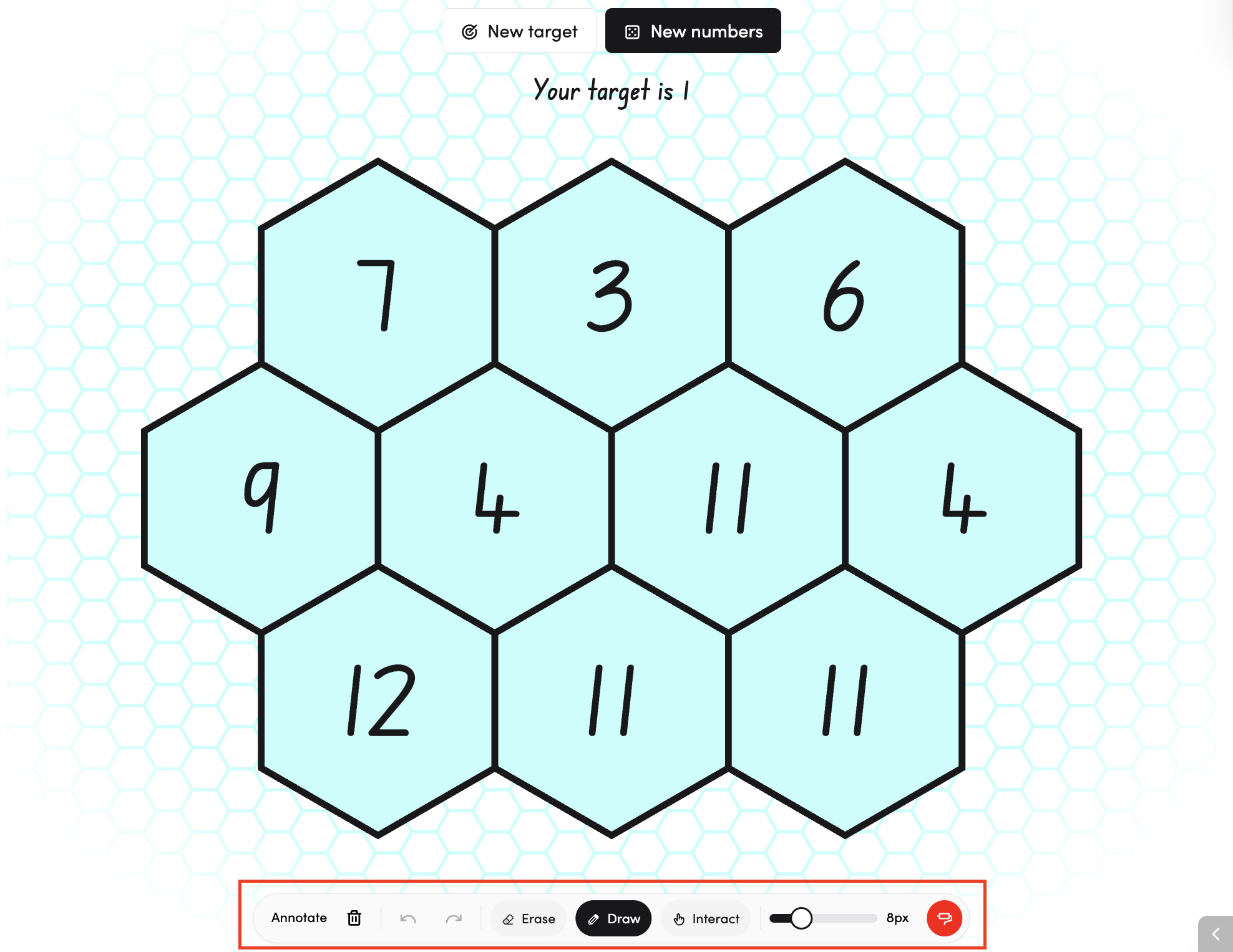 Turn on Annotations to let you or your students write directly on the screen - great for marking answers, circling numbers, or showing working out. A toolbar will appear at the bottom of the screen with options to Draw, Erase, and Interact.