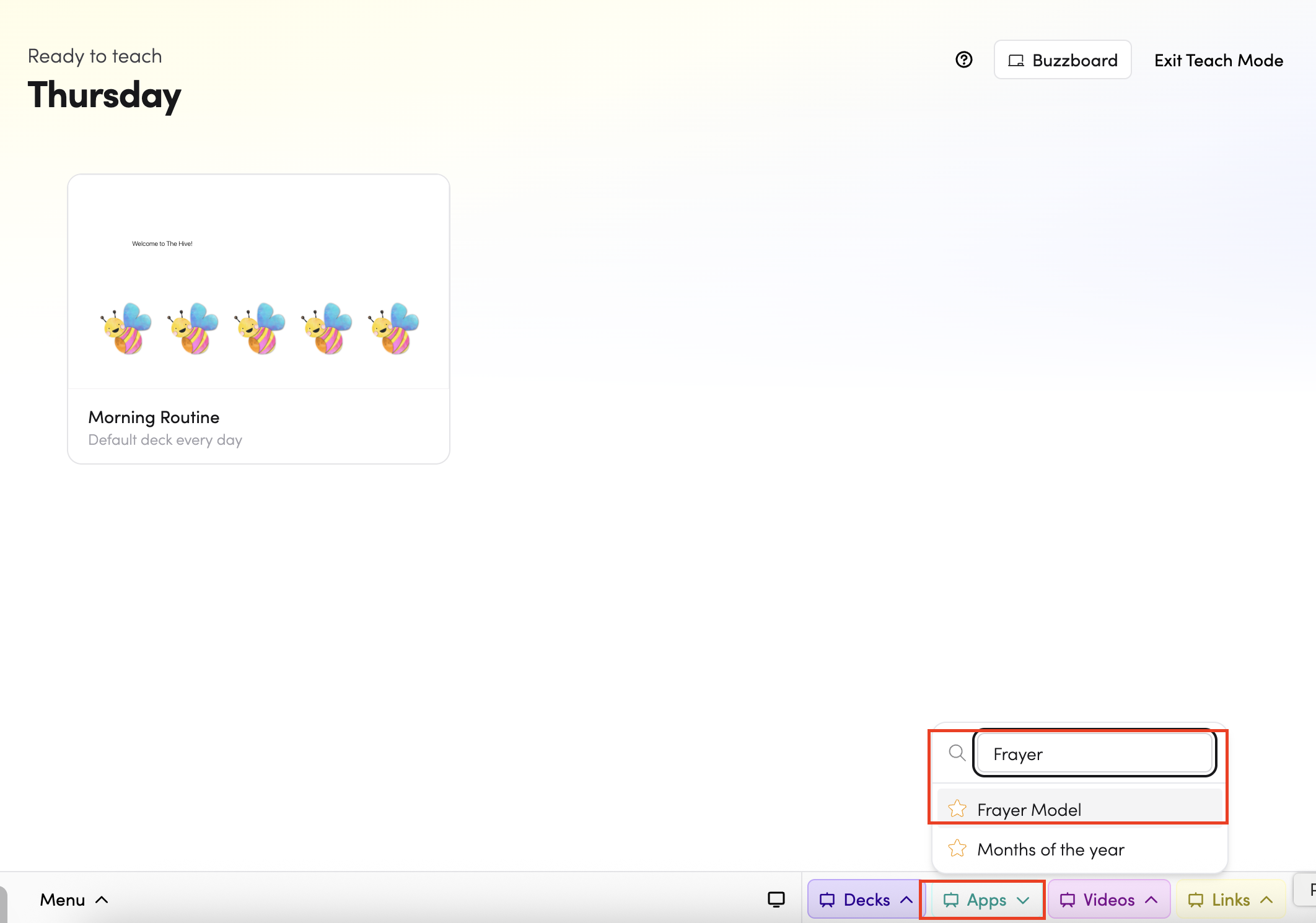 - Through Teach Mode — open Frayer Model directly from the bottom bar of Teach Mode.