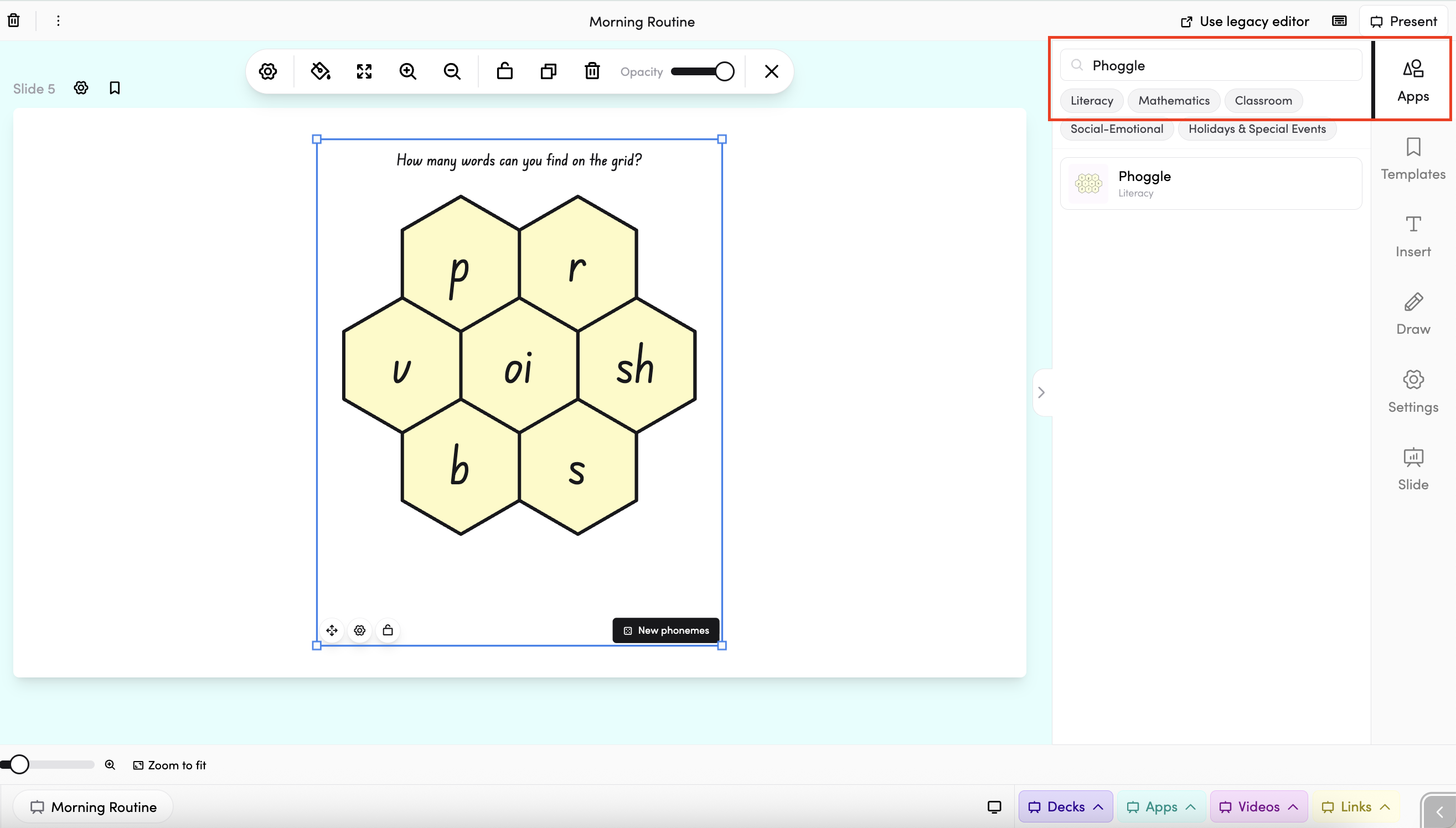 - In your slide deck — search for Phoggle in the apps panel on the right and tap it to drop it onto your slide. From there, you can move and resize it however you like. The New phonemes button sits at the top of the app, so you can refresh the grid without leaving the deck.