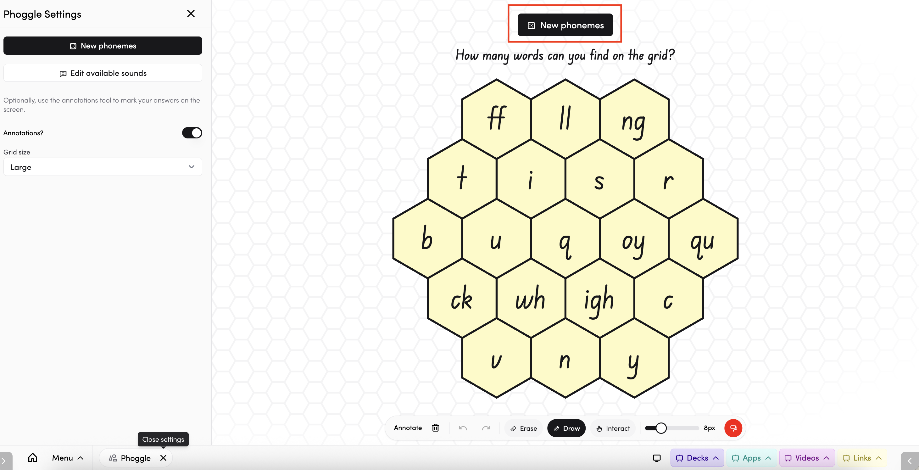 Phoggle is an interactive literacy challenge you can run with your class. A honeycomb grid is filled with phonemes, and students find as many words as they can using the sounds on the grid. You can customise which phoneme groups appear to suit your learners — from simple single sounds to digraphs and vowel phonemes.
