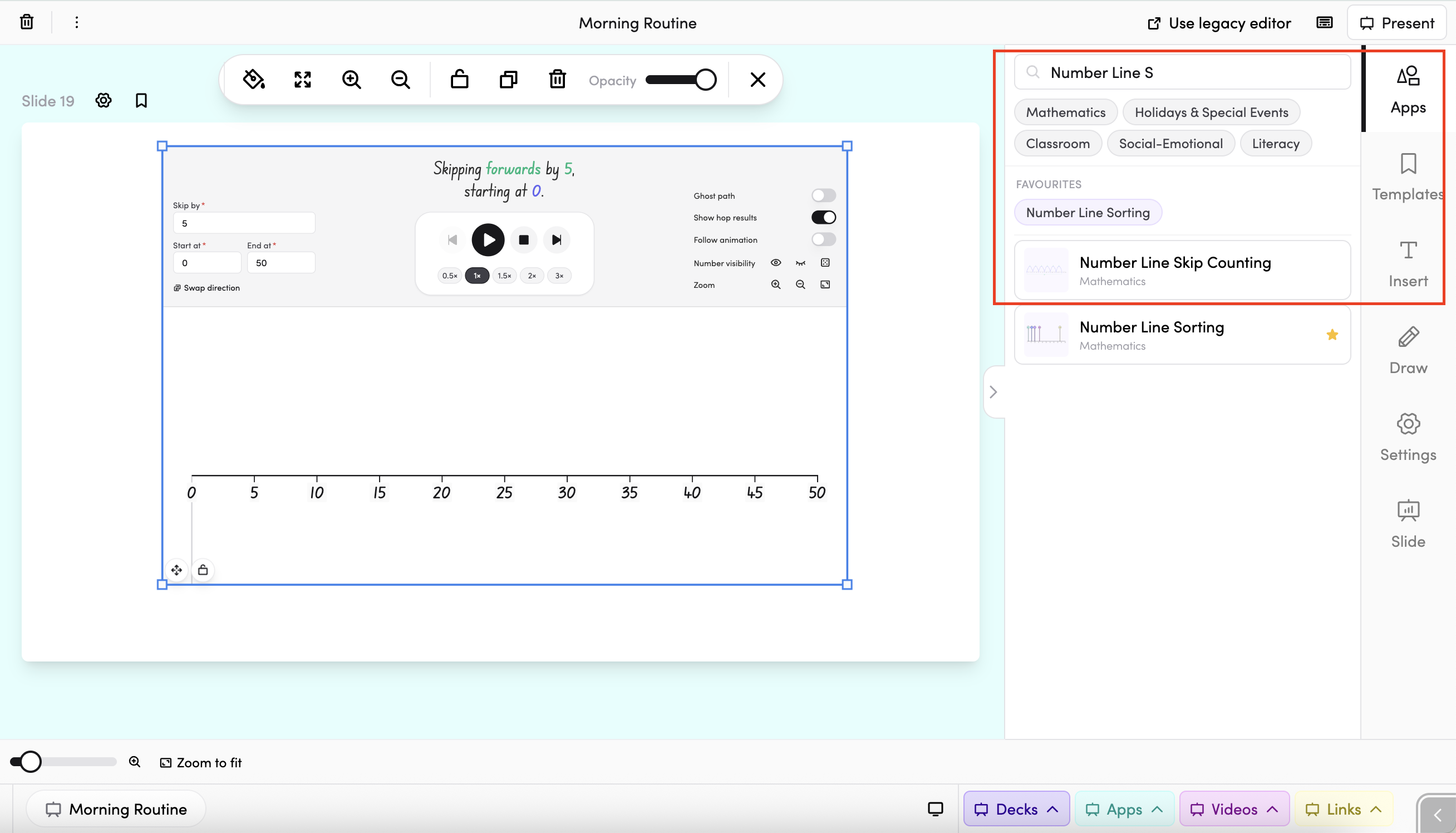 - In your slide deck — search for Number Line Skip Counting in the apps panel on the right and tap it to drop it onto your slide. From there, you can move and resize it however you like.