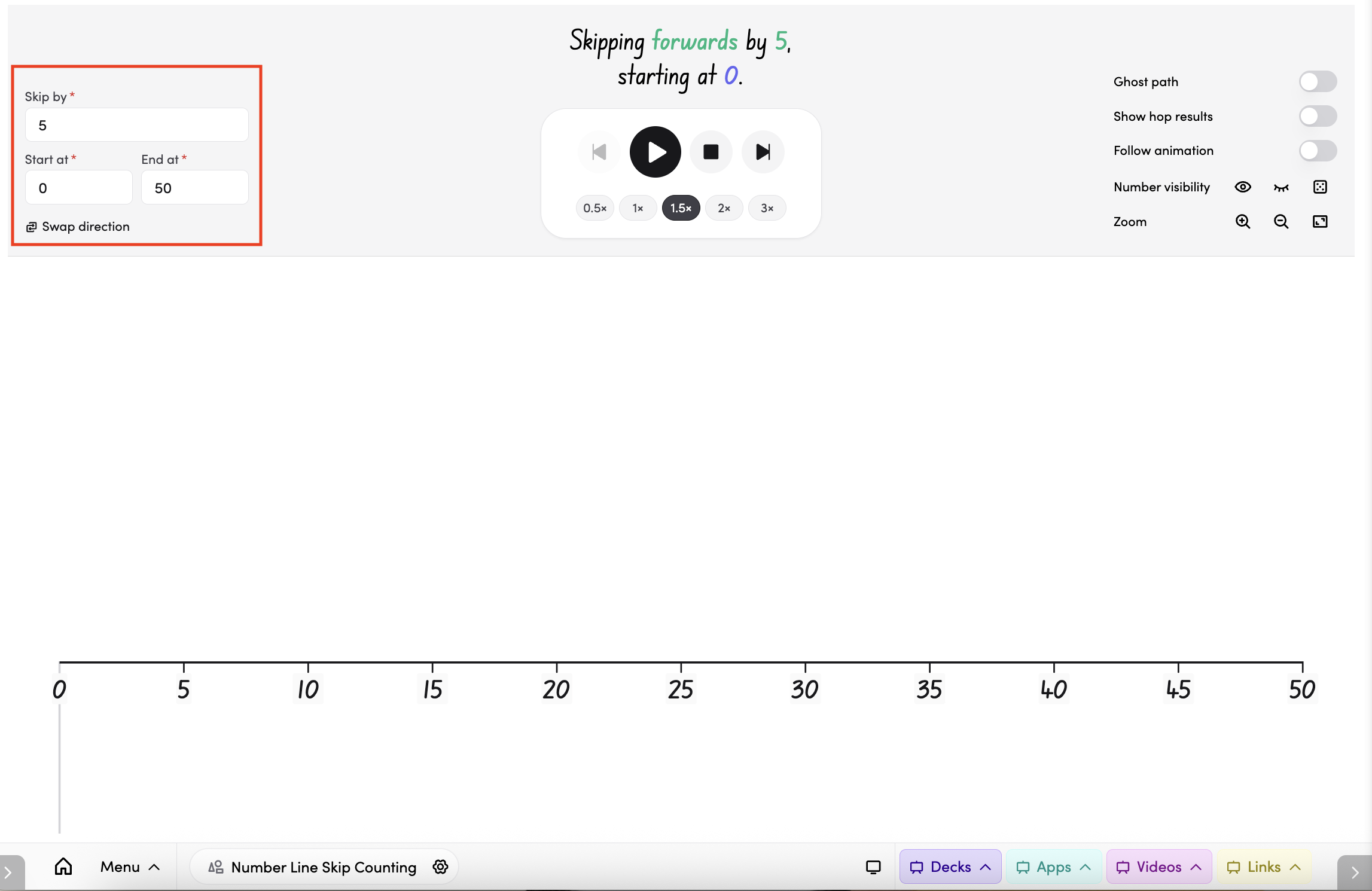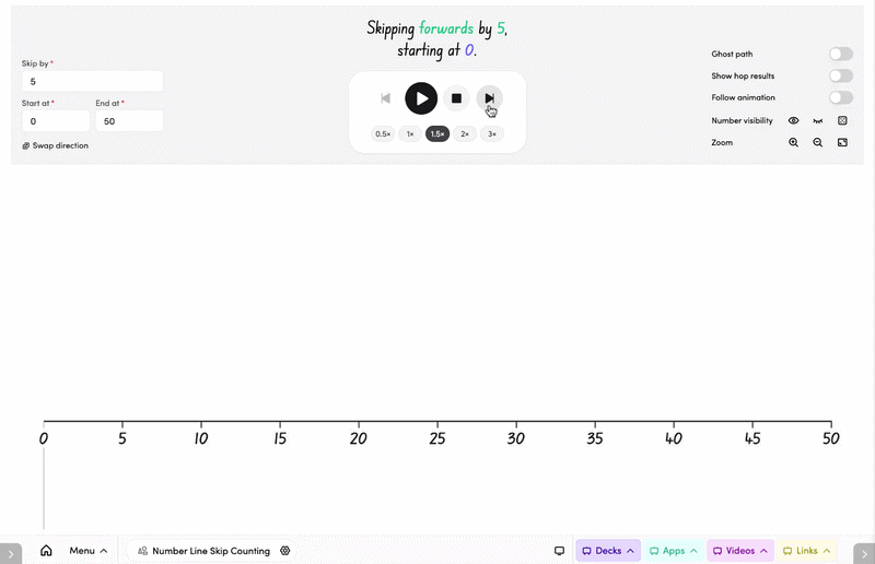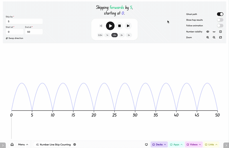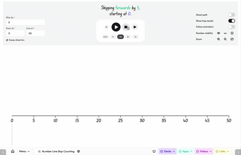 - Show hop results — turn on to display the skip value above each hop arc as it animates (e.g. +5 above each curve), so students can clearly see each jump.