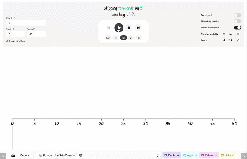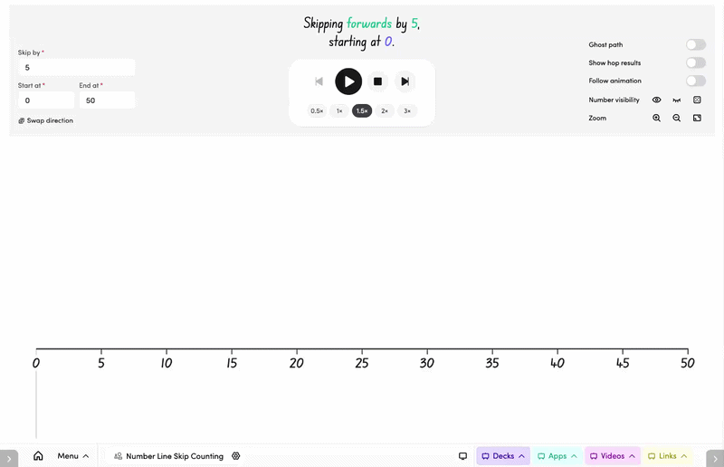 Number Line Skip Counting is an animated number line tool you can run with your class. Set a skip interval, start point, and end point, then watch the hops animate along the line — perfect for building skip counting, multiplication, and division understanding.