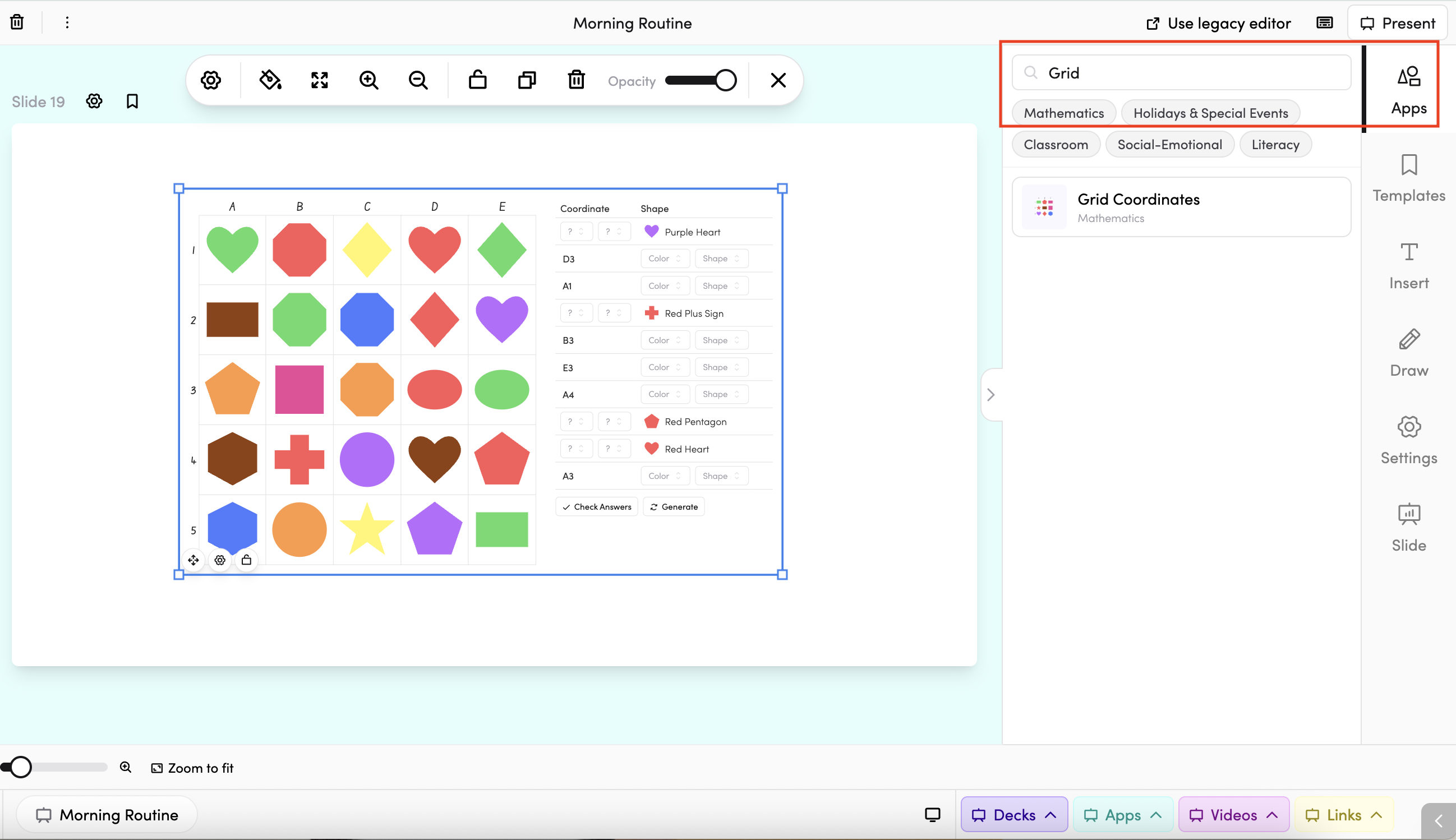 - In your slide deck — search for Grid Coordinates in the apps panel on the right and tap it to drop it onto your slide. From there, you can move and resize it however you like.