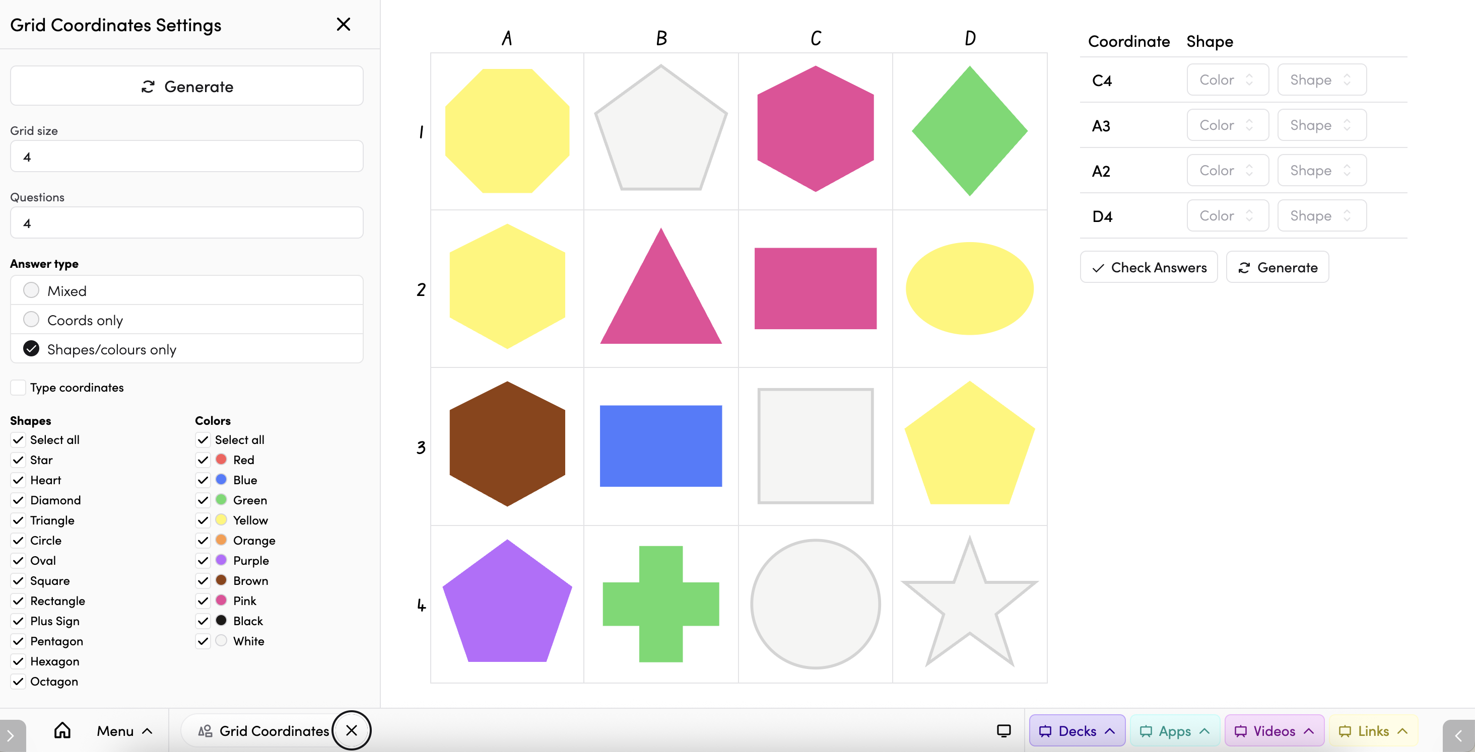 Open Grid Coordinates and a coloured grid will appear, filled with a variety of shapes at different positions. Columns are labelled with letters and rows with numbers, so each shape has a unique coordinate (e.g. D3, A1).