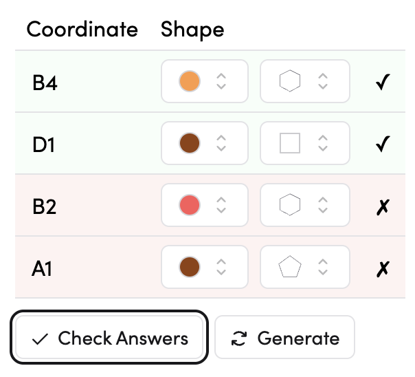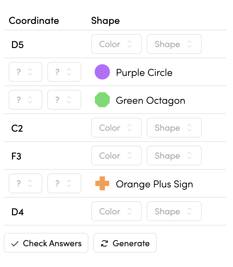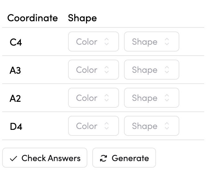 - Shape and colour only — students are given a coordinate (e.g. D3) and must identify the colour and shape at that location using the dropdowns.