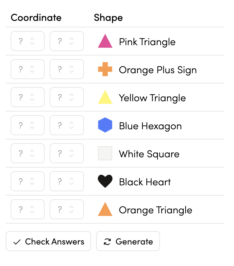 - Coordinates only — students are shown a shape and must find its coordinate on the grid.