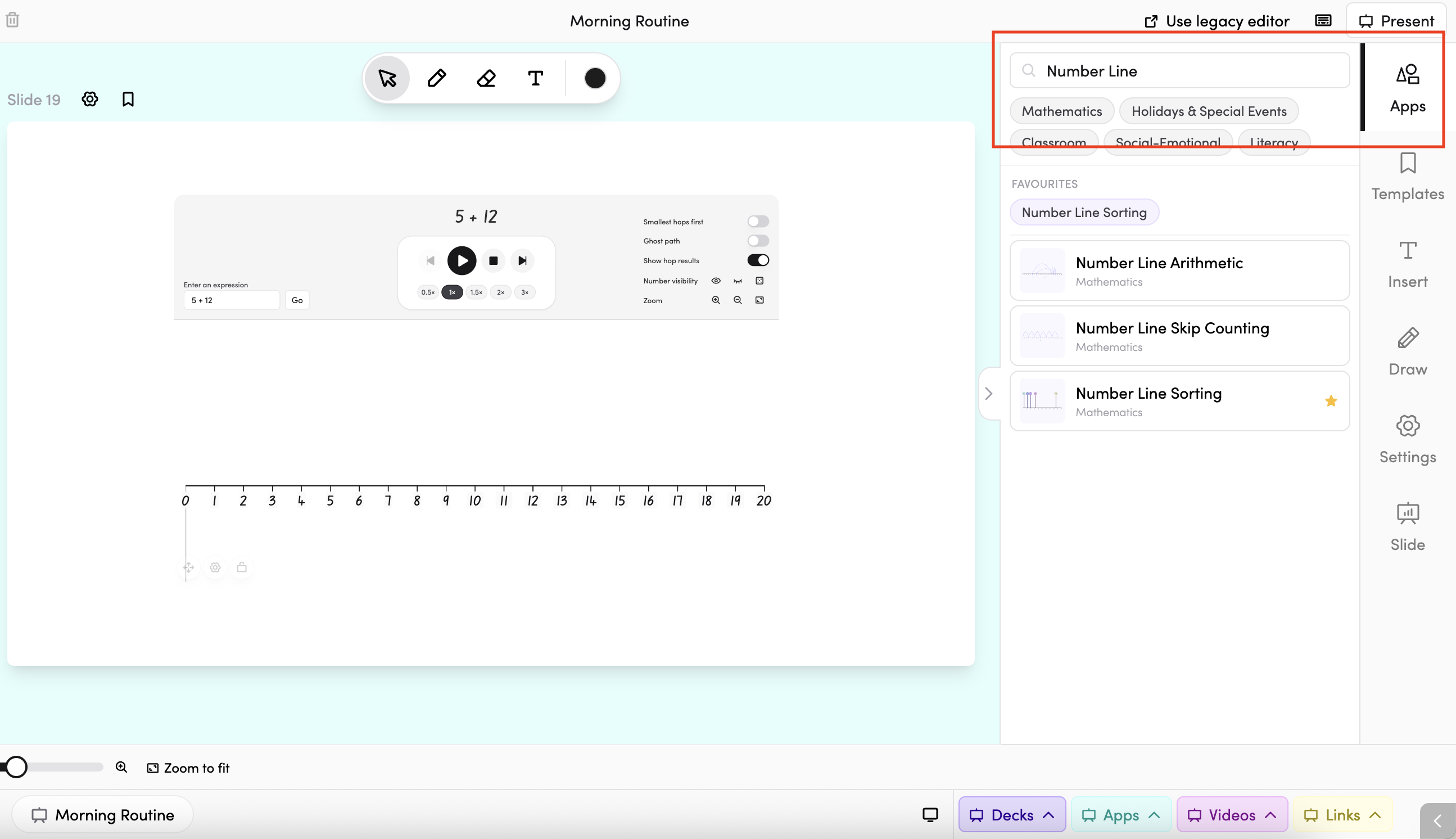 - In your slide deck — search for Number Line Arithmetic in the apps panel on the right and tap it to drop it onto your slide. From there, you can move and resize it however you like.