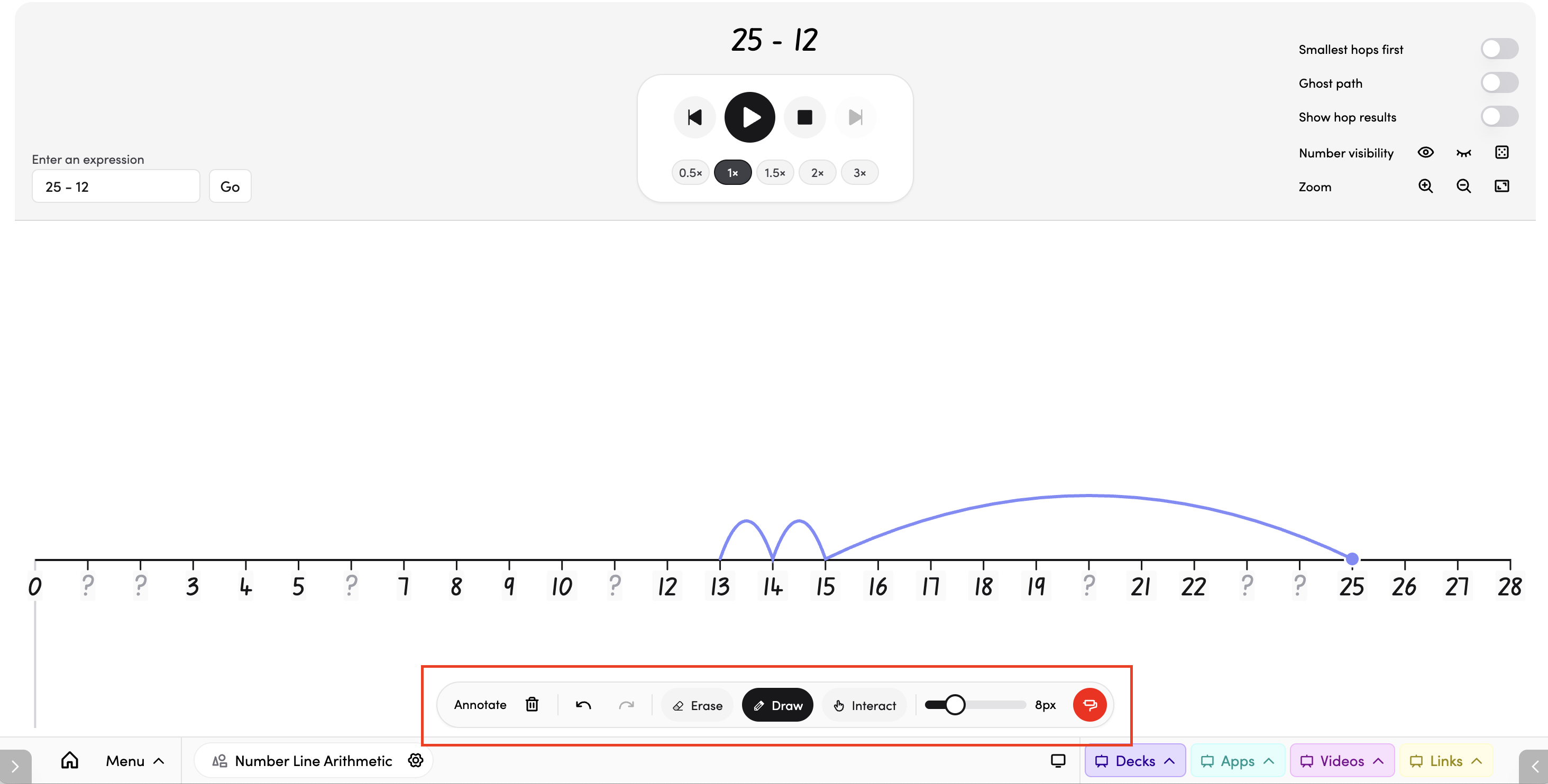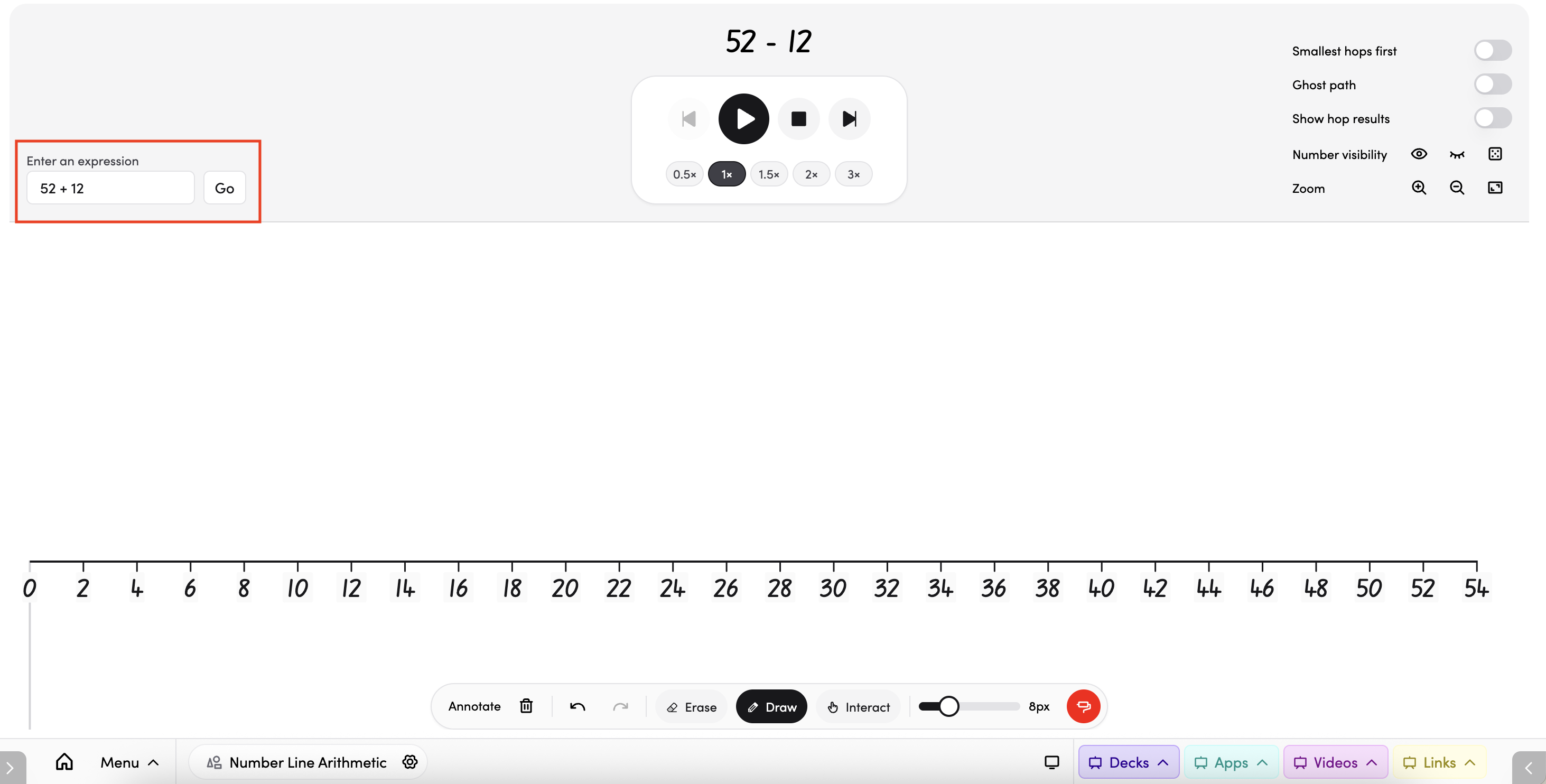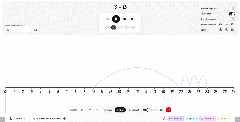 - Smallest hops first — turn on to animate the smallest part of the equation first before the larger hop, useful for modelling number strategies.