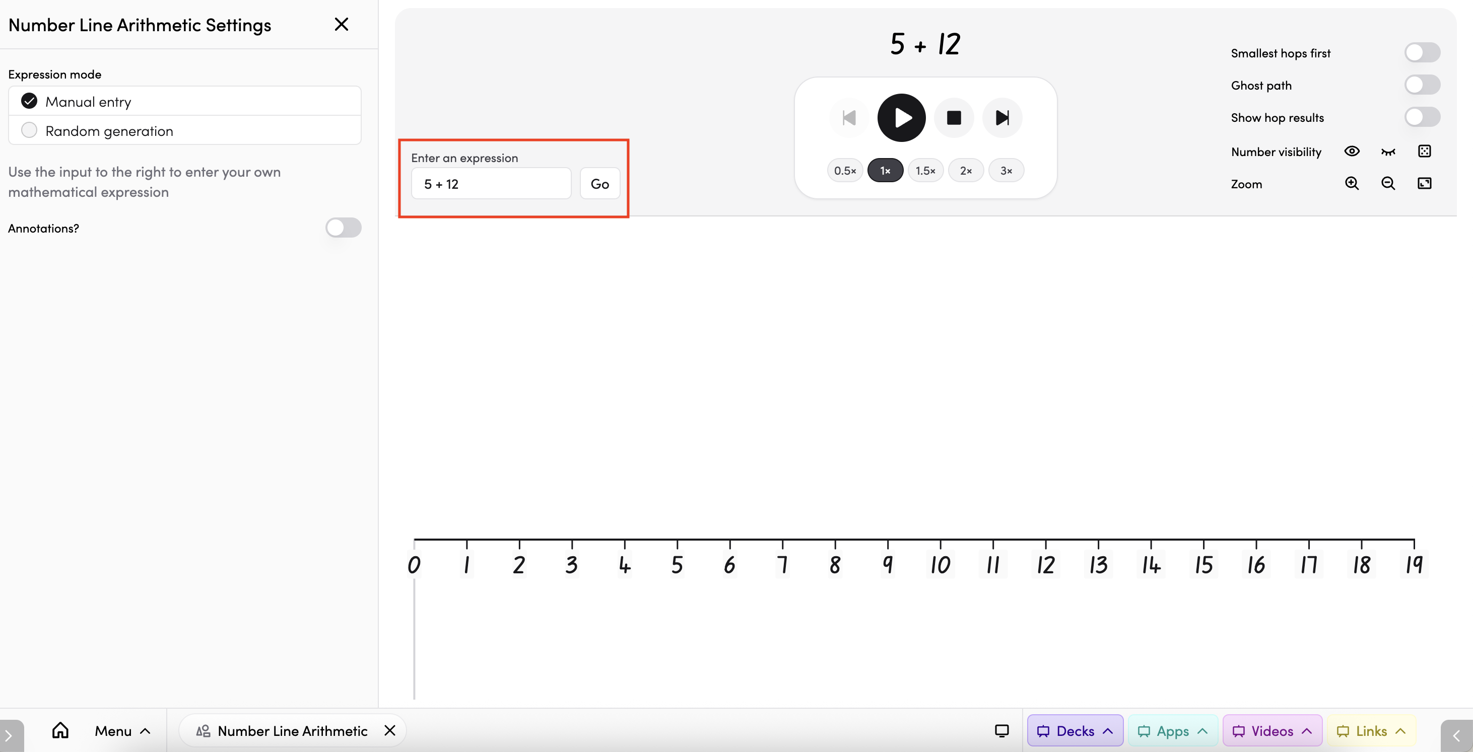 - Manual entry — type your own mathematical expression into the input field (e.g. 5 + 12) and tap Go to load it onto the number line.