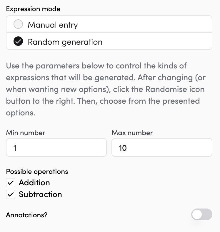 - Random generation — the app generates a random expression for you. A set of options appears on the left so you can quickly switch between different randomly generated equations.