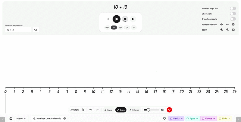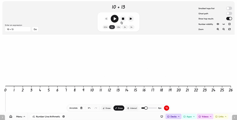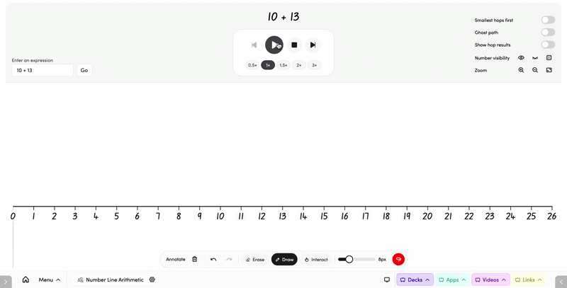 Number Line Arithmetic is an animated number line tool that visualises mathematical expressions as hops along a line. Type in your own equation or let the app generate one randomly — perfect for modelling addition, subtraction, and multi-step calculations with your class.