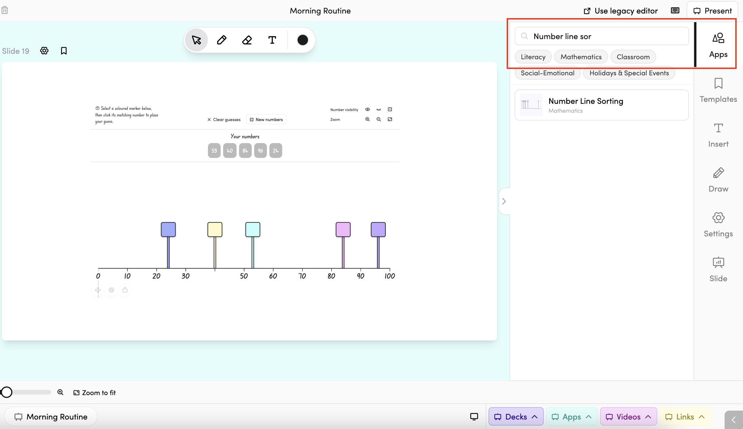 - In your slide deck — search for Number Line Sorting in the apps panel on the right and tap it to drop it onto your slide. From there, you can move and resize it however you like.