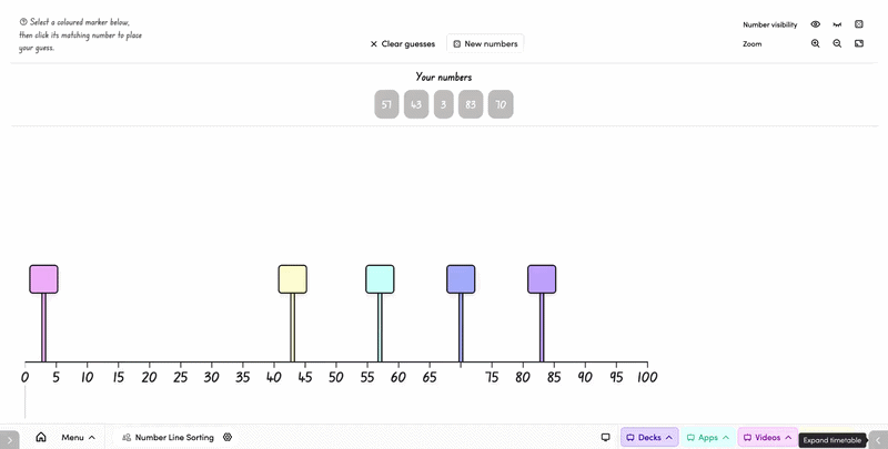 Once generated, coloured markers will appear on the number line, and the numbers to be placed are shown at the top of the screen under 'Your numbers'.