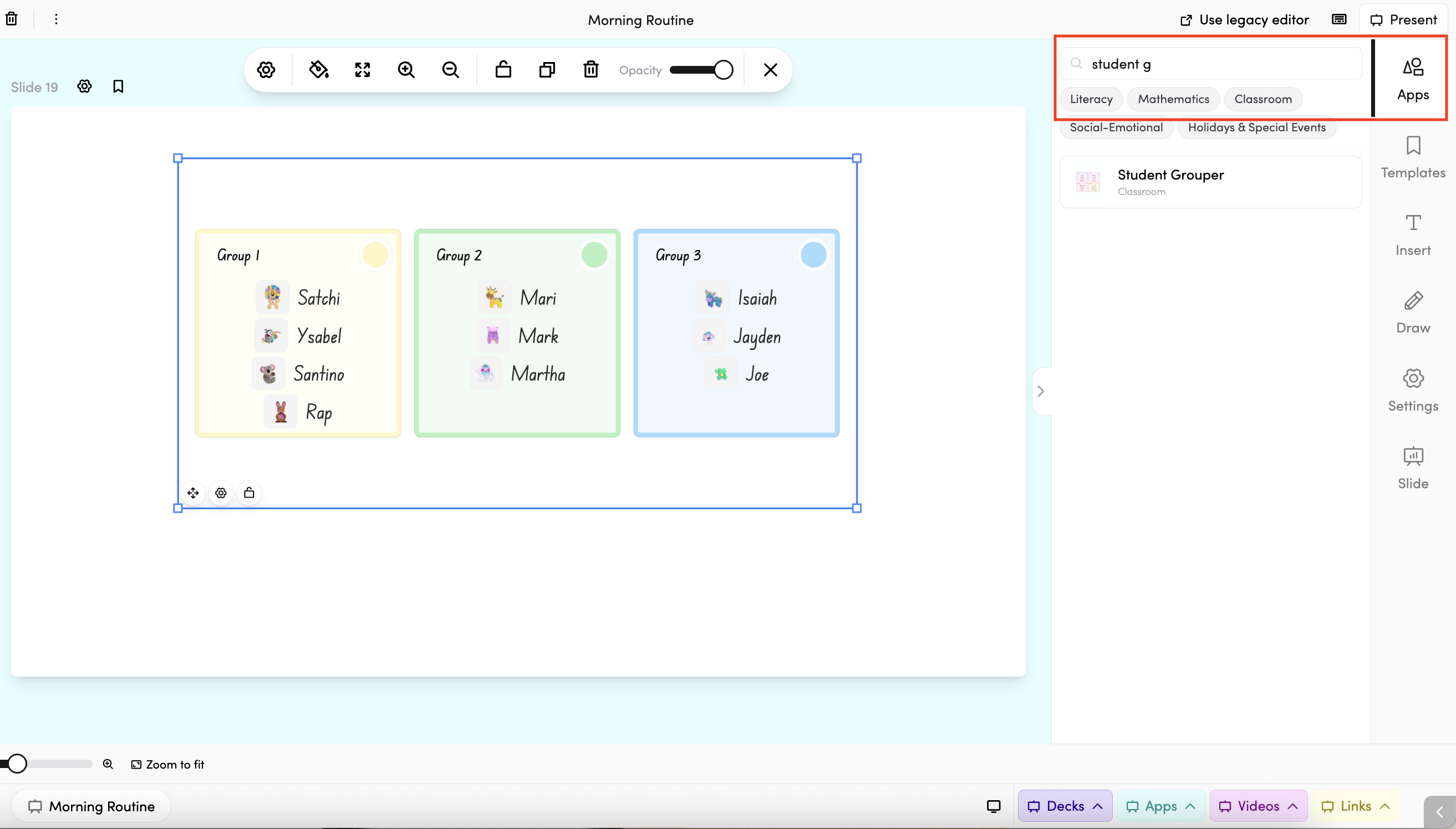 - In your slide deck — search for Student Grouper in the apps panel on the right and tap it to drop it onto your slide. From there, you can move and resize it however you like.