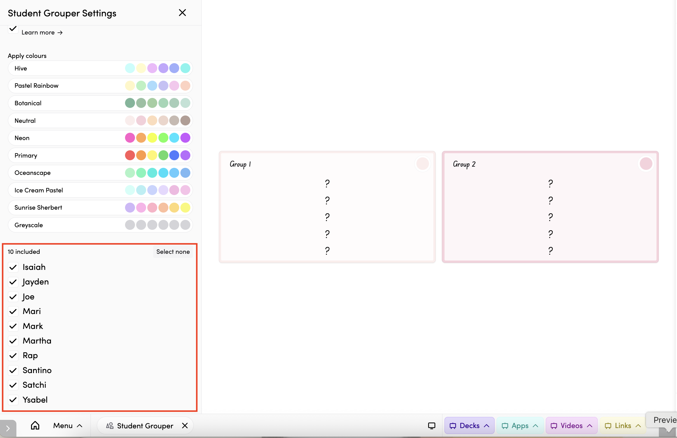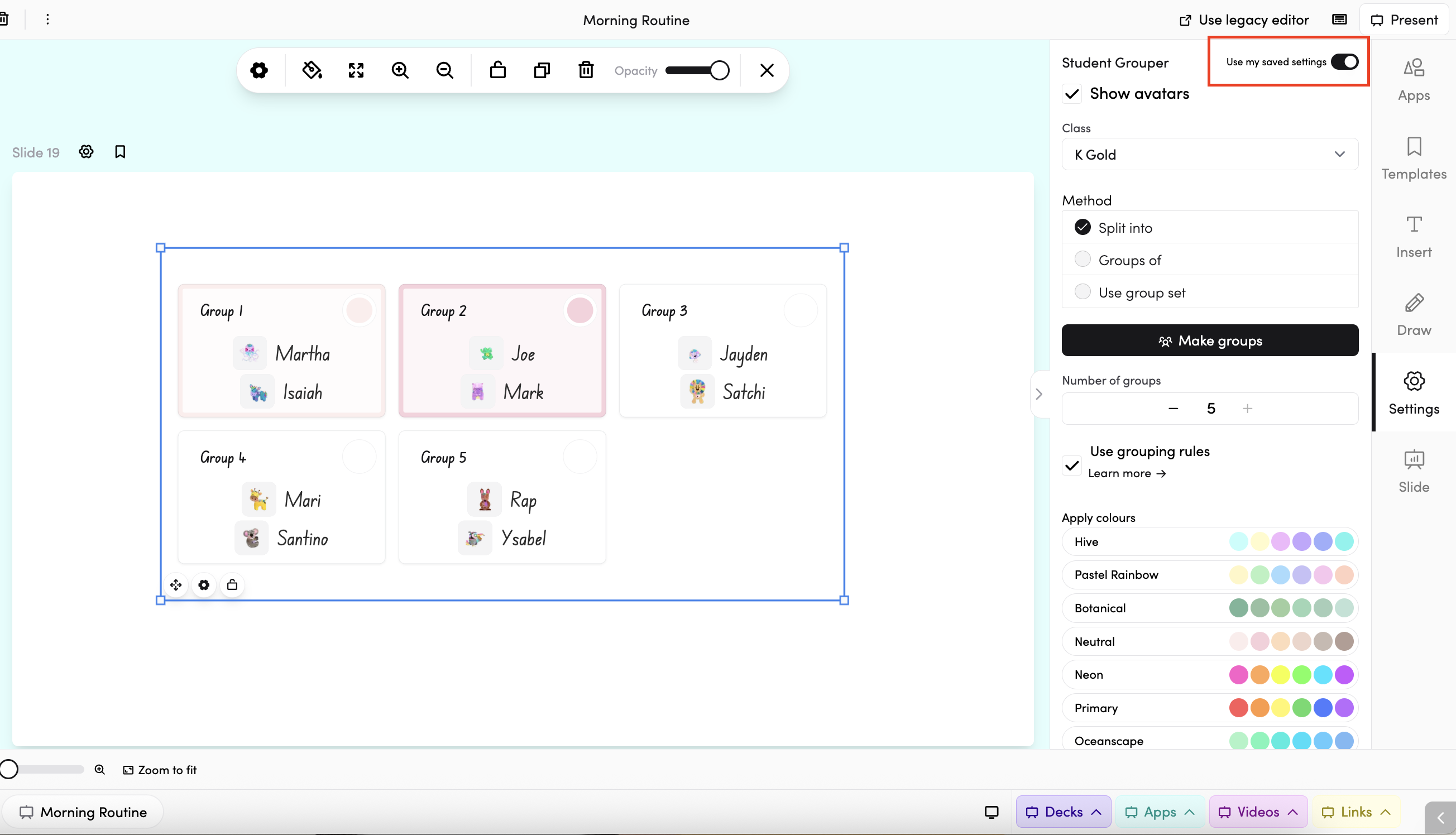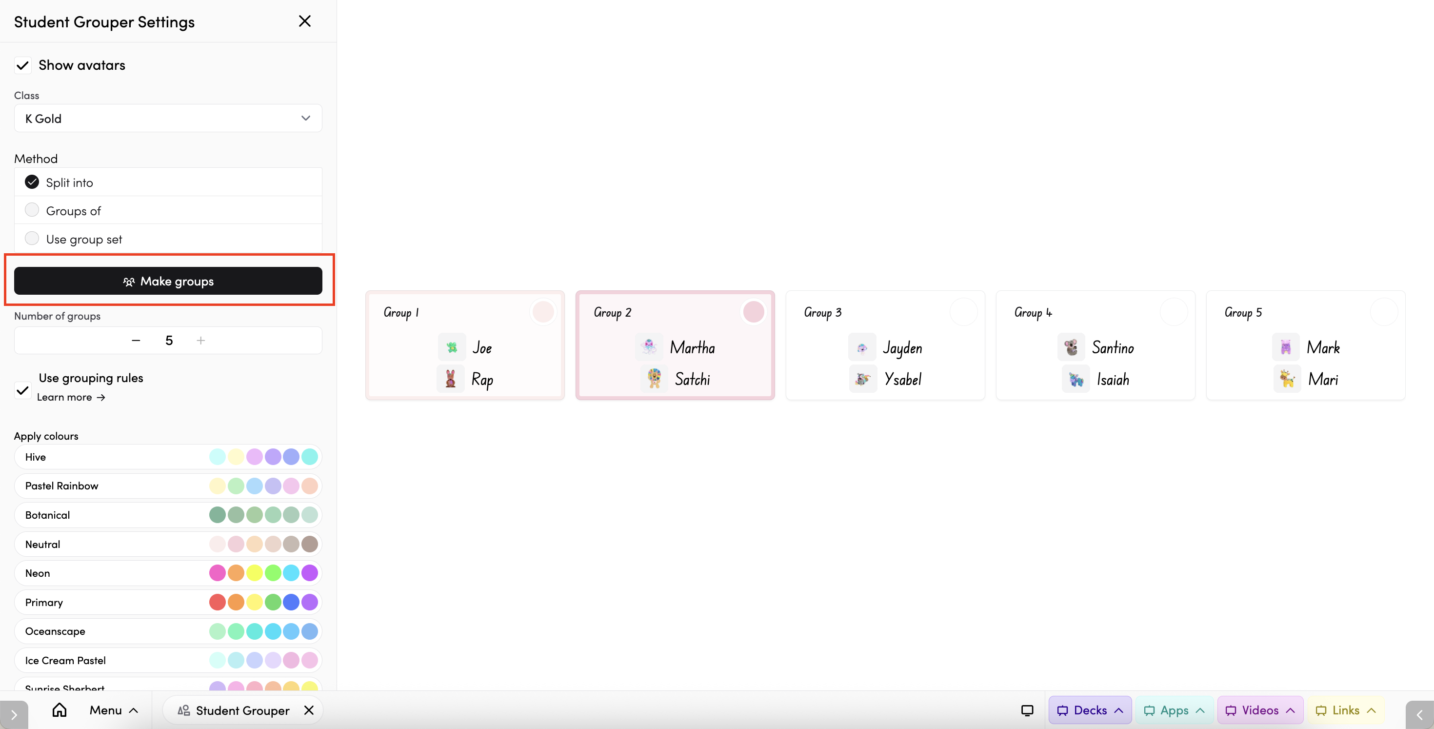 Choose a colour palette under Apply colours to colour-code the groups on screen. Options include Hive, Pastel Rainbow, Botanical, Neutral, Neon, Primary, Oceanscape, and more.