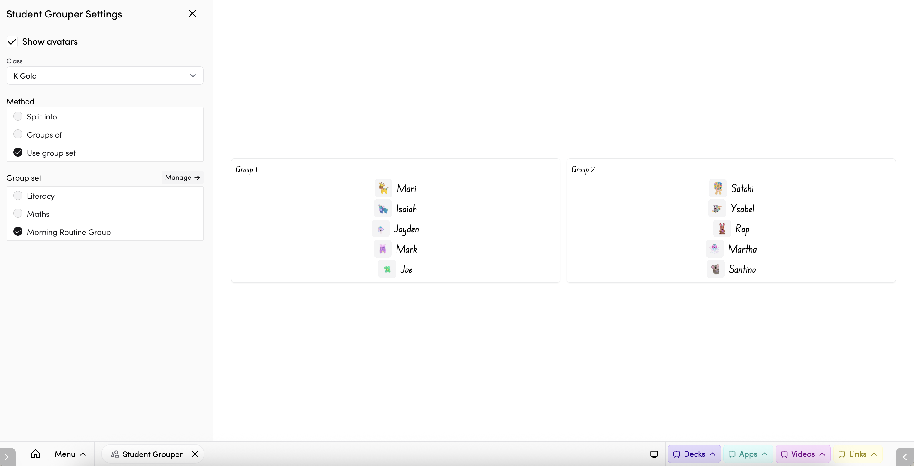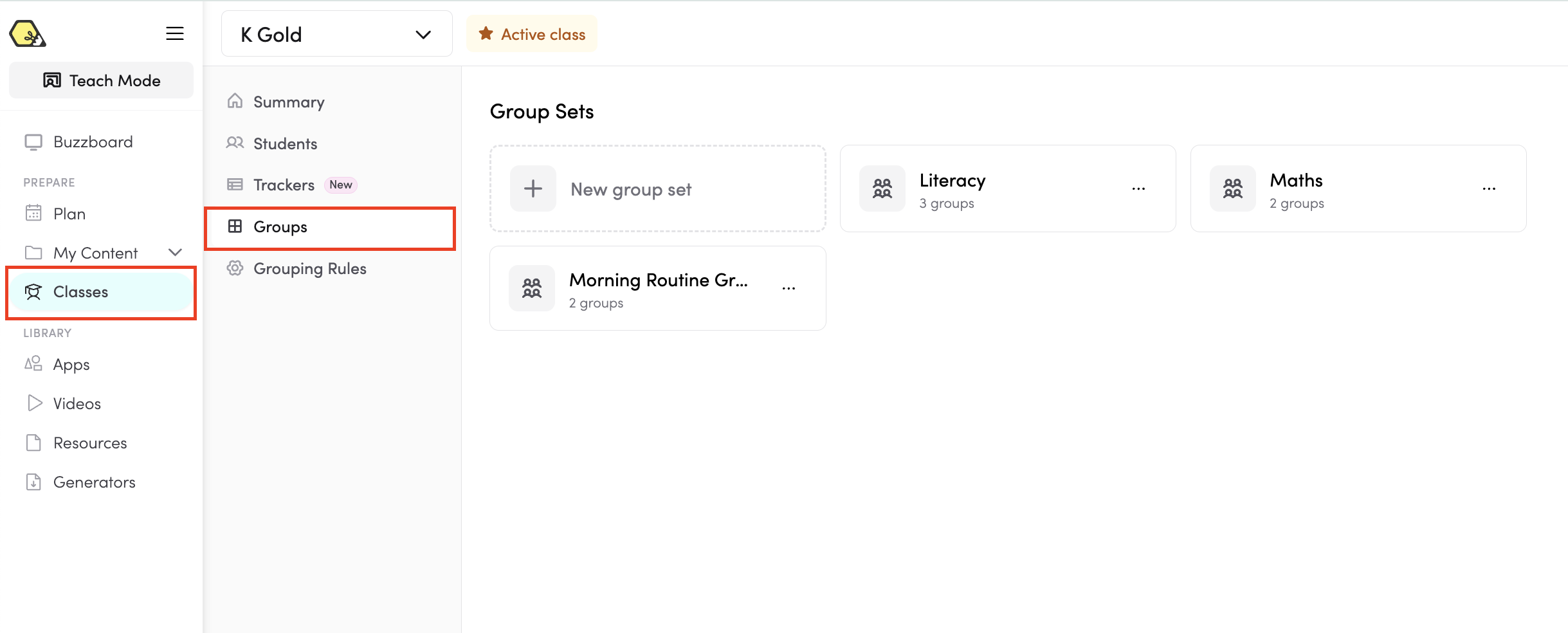 - Use group set — display your existing, pre-set groups (e.g. Literacy Groups, Maths Groups). See below for how to set these up.