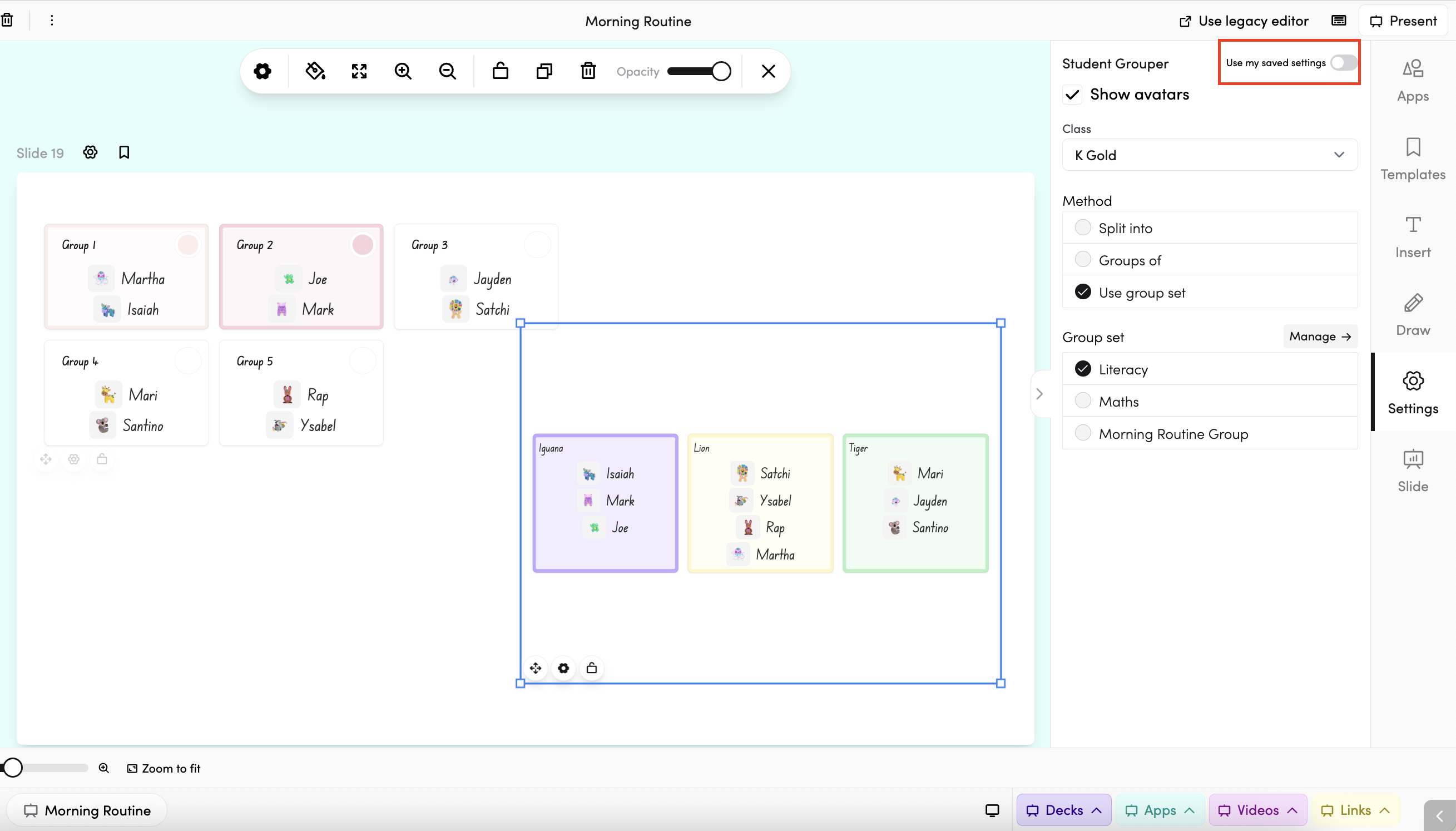 When Student Grouper is added in a slide, the Use my saved settings toggle controls how the app behaves: