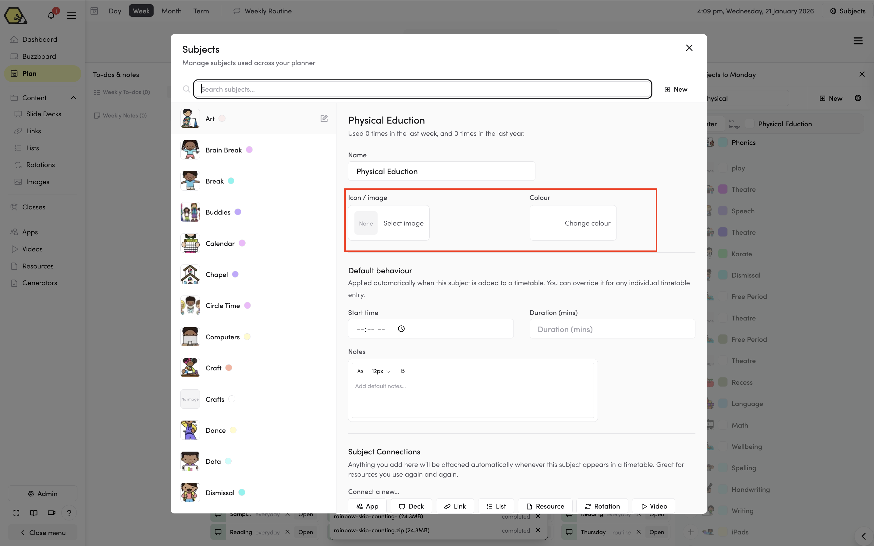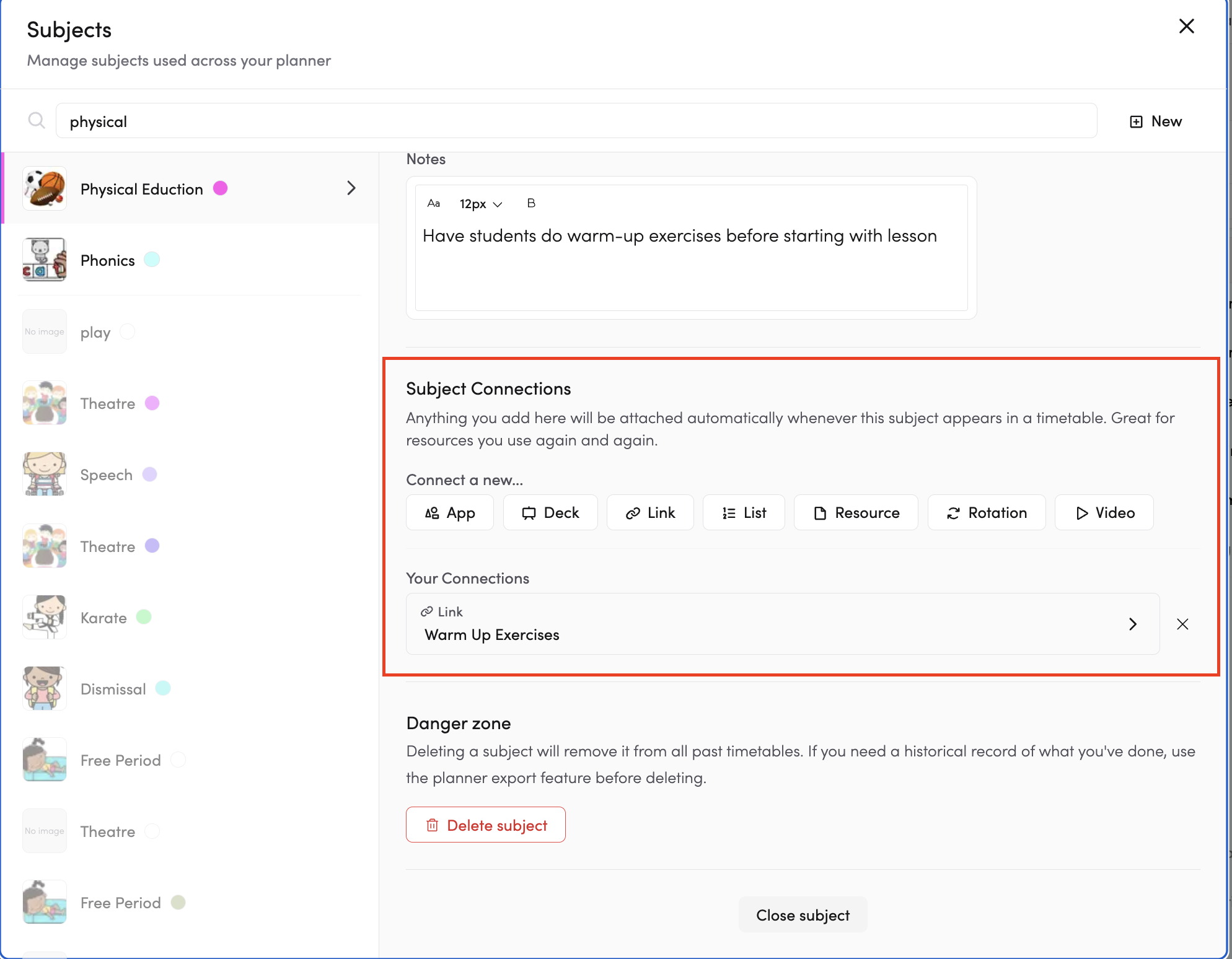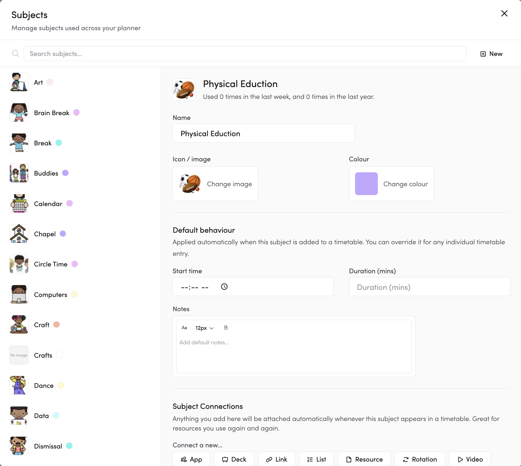 - Adding default behaviours like start times, duration, notes, and connections will automatically apply these settings every time the subject is added to a timetable.