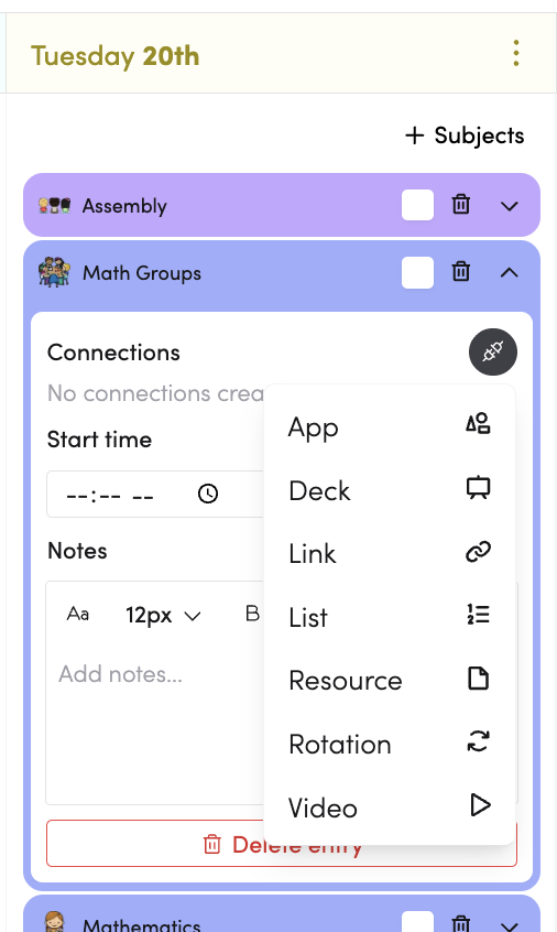 - You can also add one-off connections by expanding a subject directly within your Day or Week plan. These connections are unique to that specific entry and won't affect your recurring Weekly Routine.